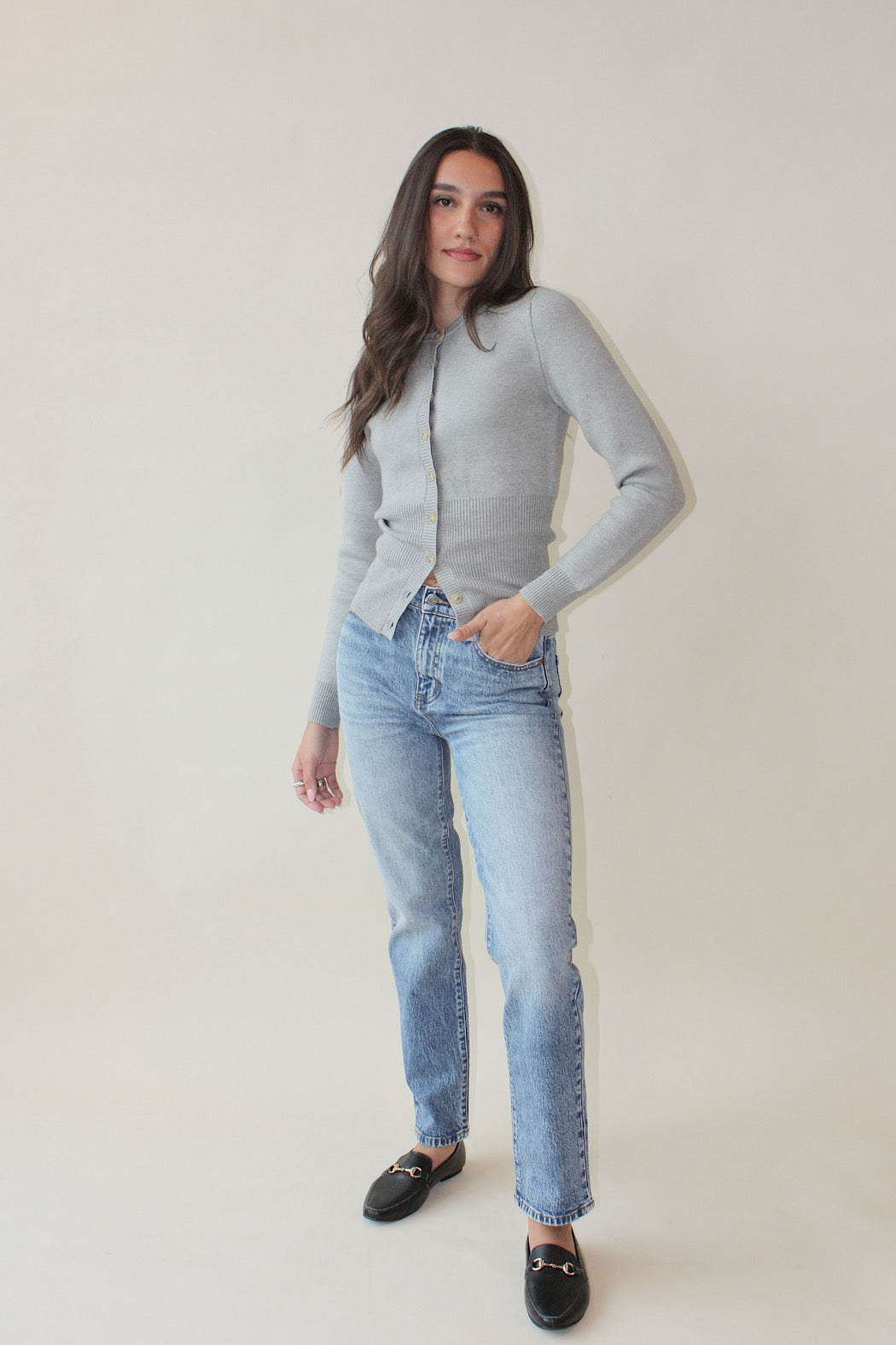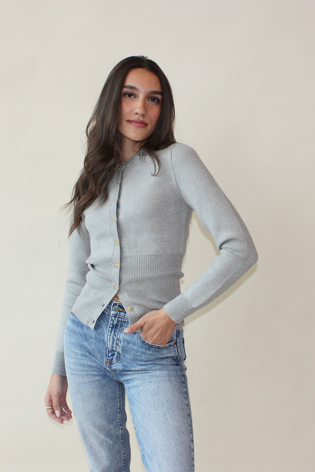 RESTOCKED! The wide ribbed hemline can give it a bubble style or pull it down for a longer, sleeker look! Keep it buttoned or unbuttoned; you'll wear this cardigan all year long! The black we sold out of super fast... so grab this perfect grey hue before it sells out again!