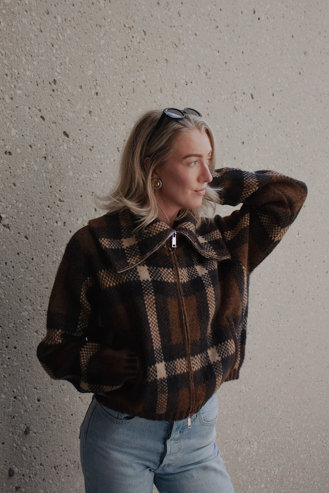 Enhance your cold-weather wardrobe with this elegant, cozy plaid sweater jacket. It includes a fold-over collar, a two-way zipper closure, long sleeves, convenient front pockets, and a straight hemline for a polished finish.