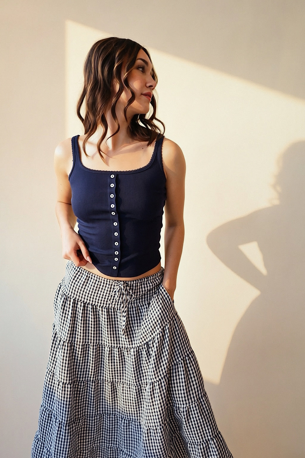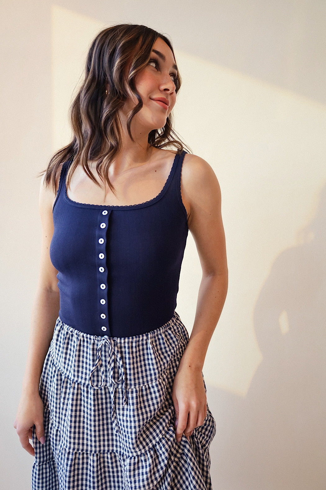 A versatile camisole tank featuring a delicate lace trim and stretchy pointelle fabric design, this can easily be matched with any favorite bottoms including jeans, skirts, shorts or just throw on over your bathing suit and your good to go! Shop the Jeans or the SKIRT!