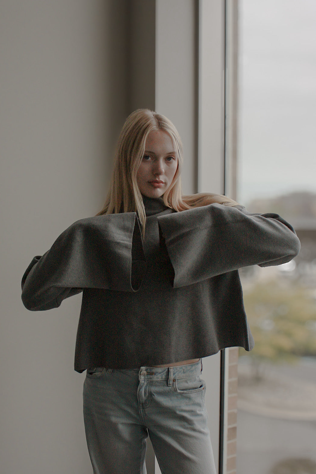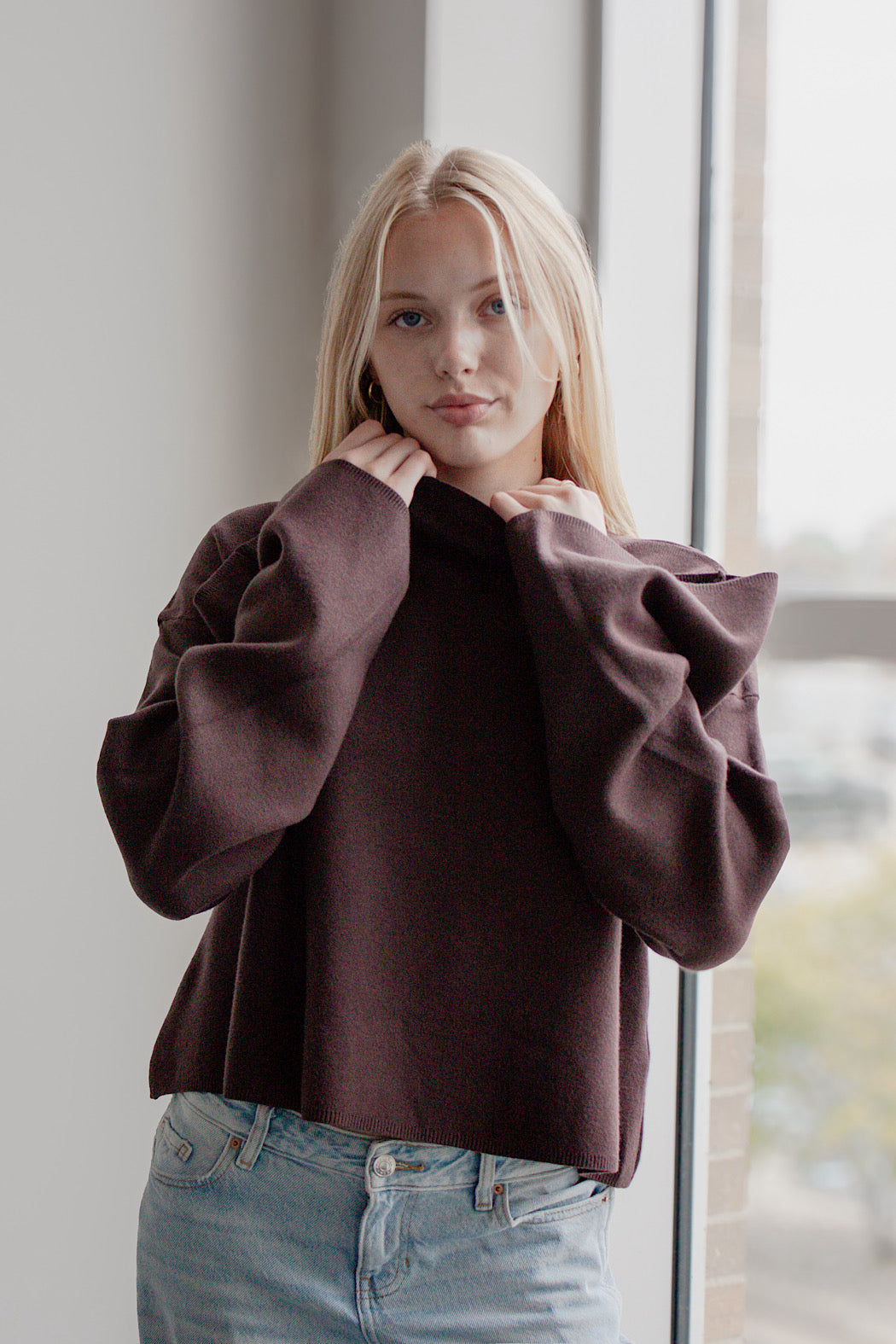 This cropped box-style sweater, crafted from a soft viscose blend, showcases a high mock neck and flared long sleeves. Its versatile neutral tones make it an ideal layering piece, perfectly suited for pairing with any outfit throughout the colder months.