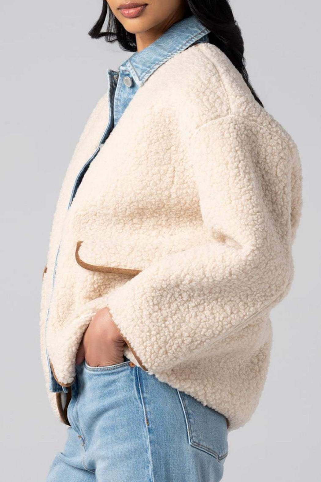 Layer with confidence in this hybrid jacket that merges cozy sherpa fleece with structured denim accents. The spread collar and front button closures deliver a polished silhouette, while faux-suede piping adds refined detail. Functional flap hip pockets keep essentials within reach. A thoughtful blend of textures and materials that elevates your casual wardrobe.