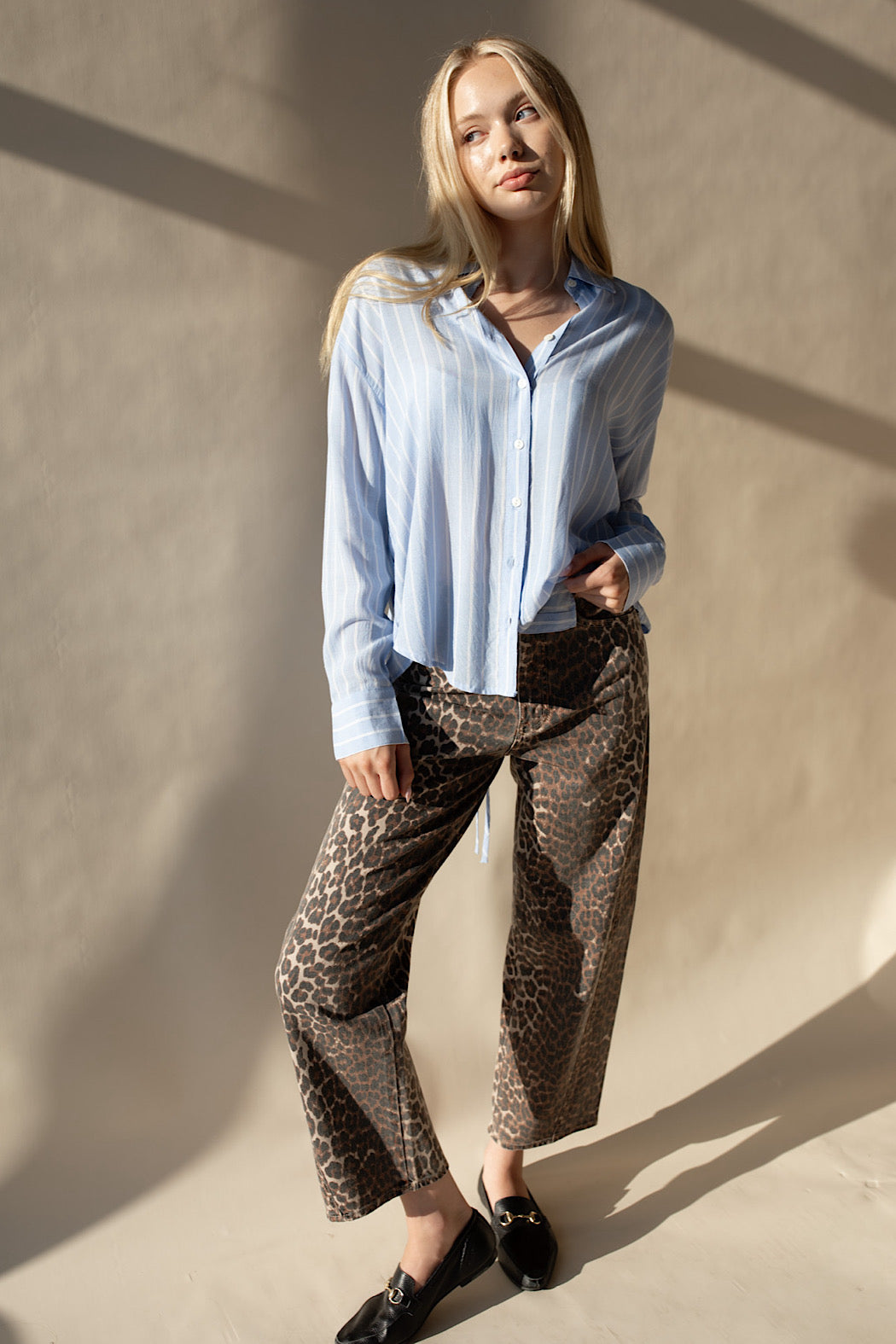 A classic made exciting with a striped menswear inspired button up, that also features a tie in the back for chic layering.