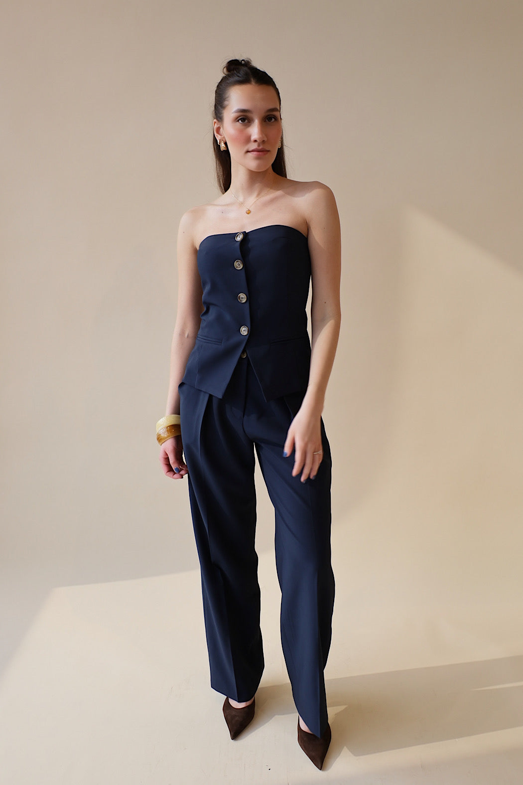 A foundational piece that balances soft tailoring with a commanding full-length profile. It features a structured waistband with belt loops that leads into a relaxed silhouette, providing a composed yet comfortable fit through the hips. Pair with the MATCHING TOP (in Indigo) for a complete, elevated work to play look!