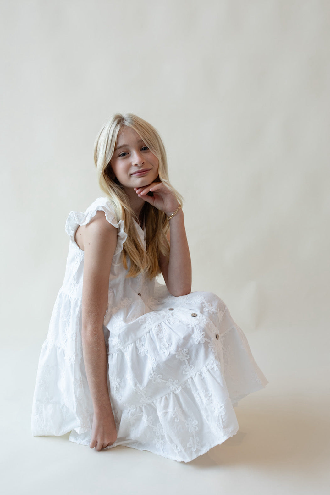 Crafted from textured floral fabric available in youth sizes, this dress features a tiered silhouette and decorative front buttons for a boho-inspired look. Designed with a comfortable lining, it offers a perfect mom-and-me matching option. Shop the MATCHING WOMEN HERE.