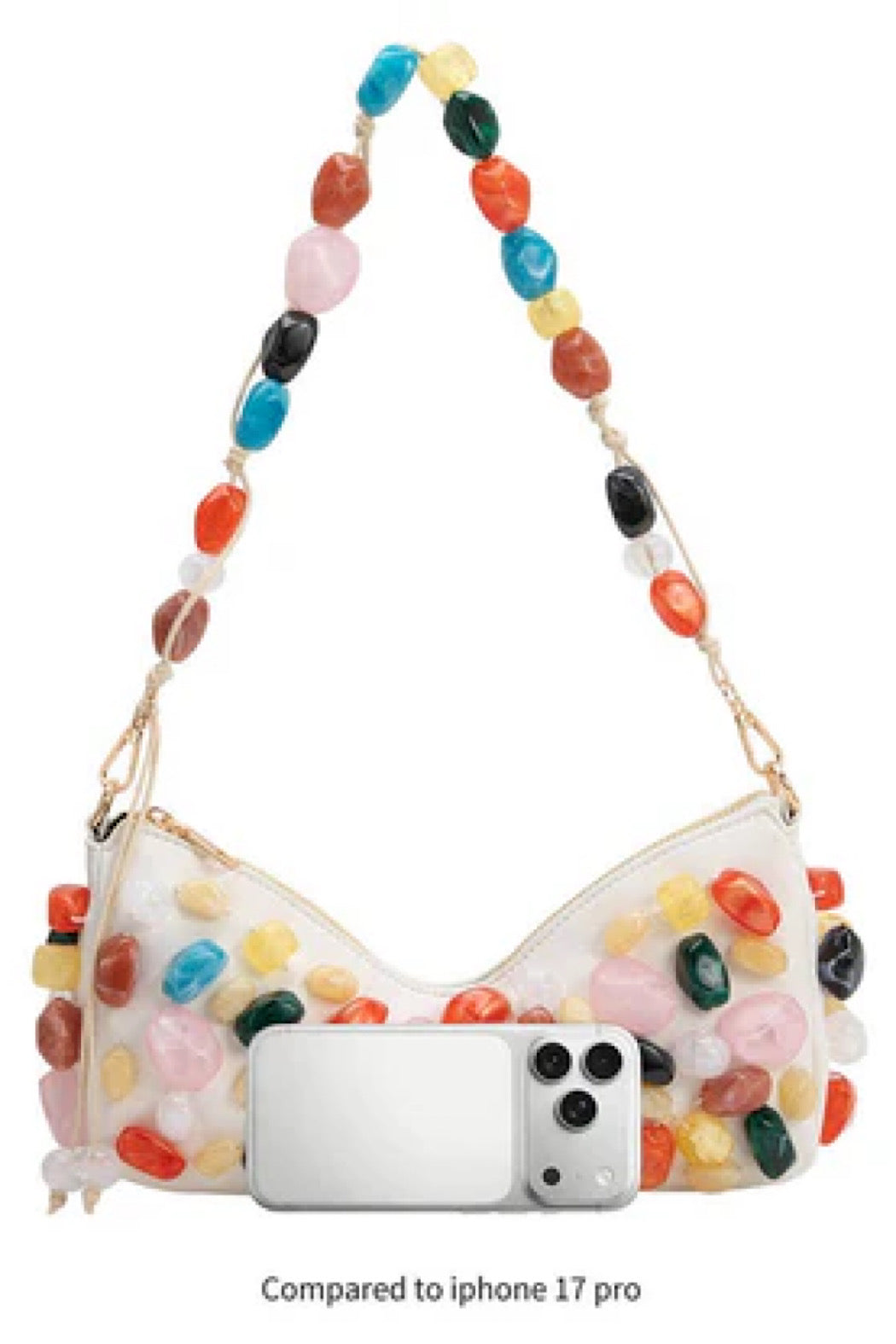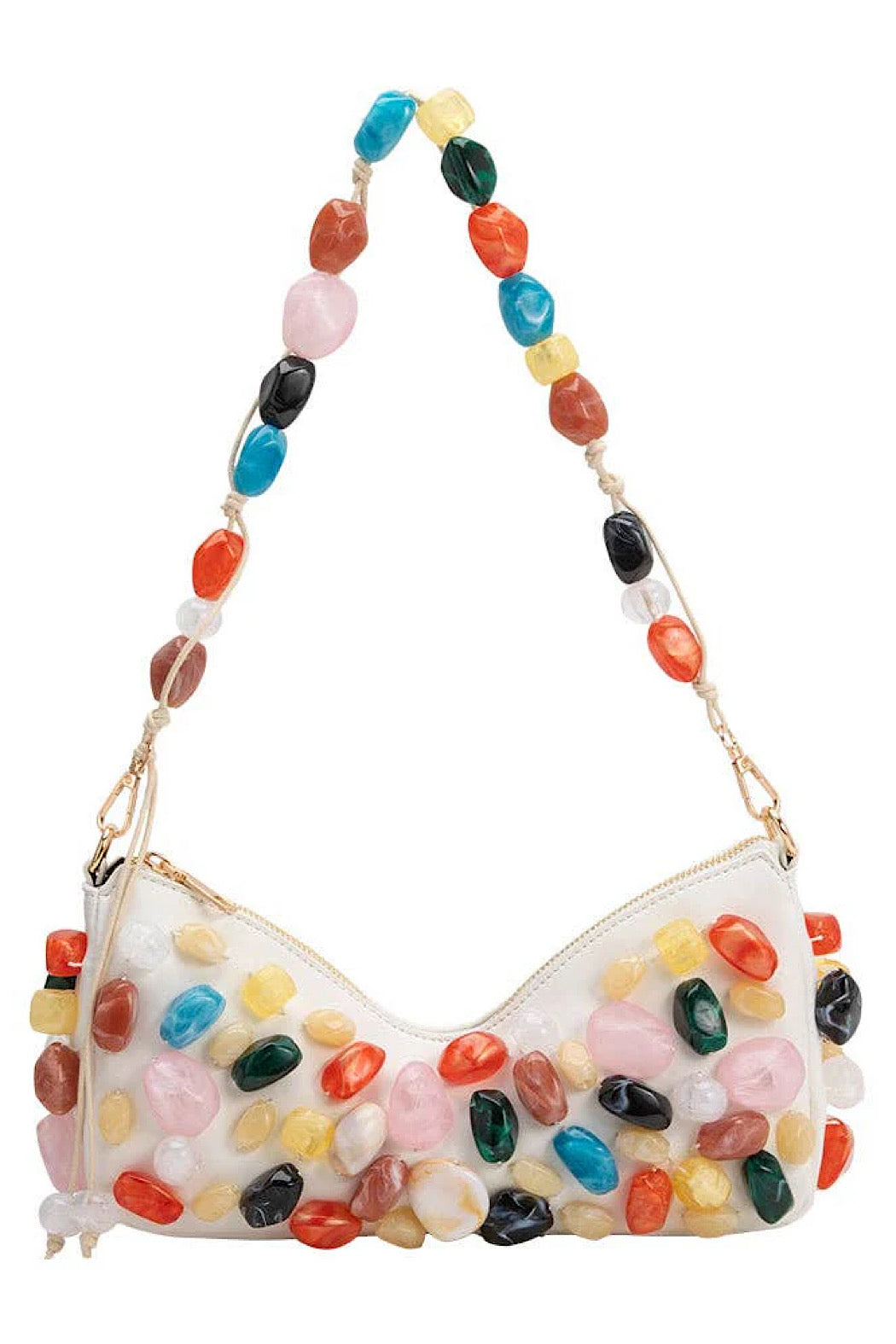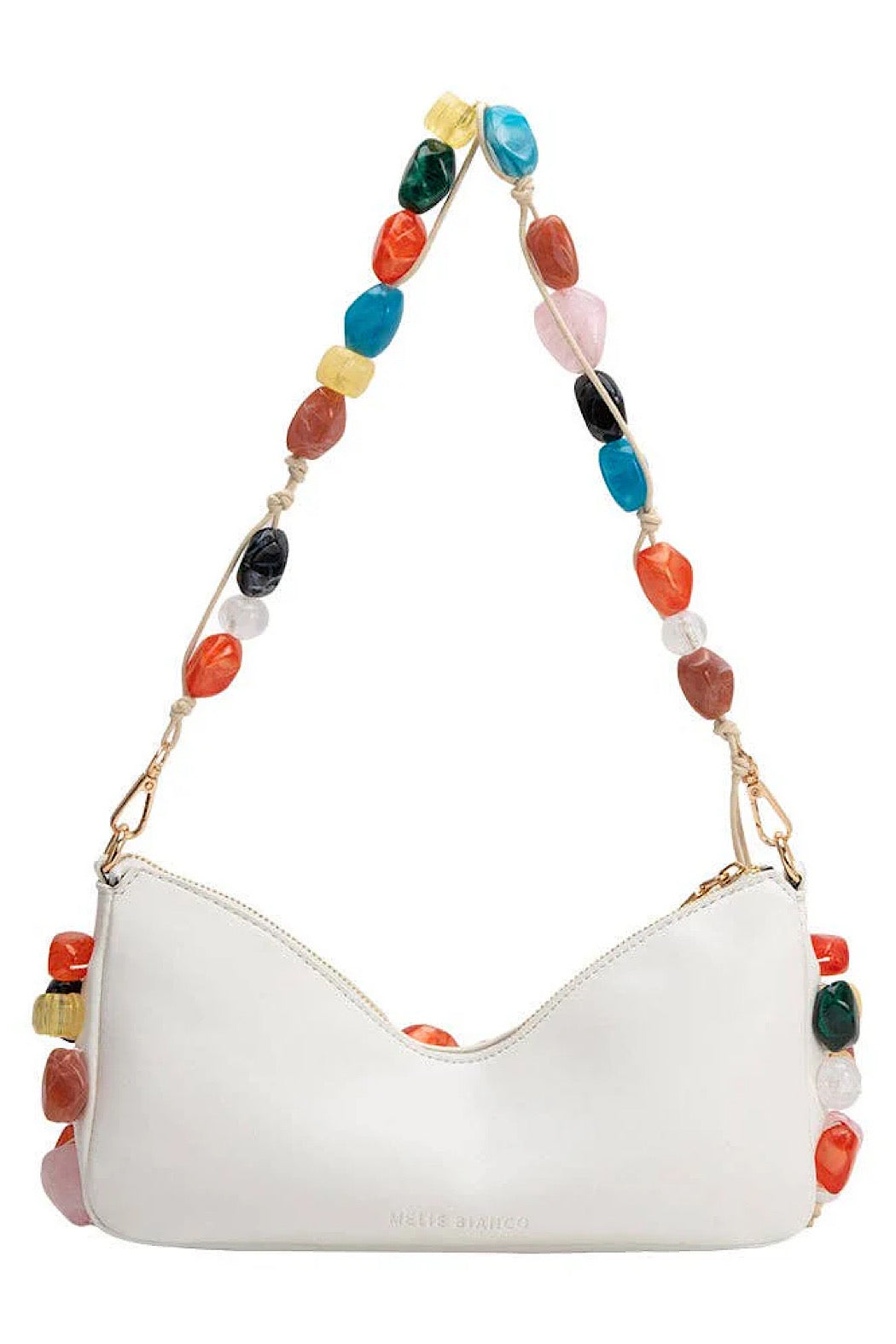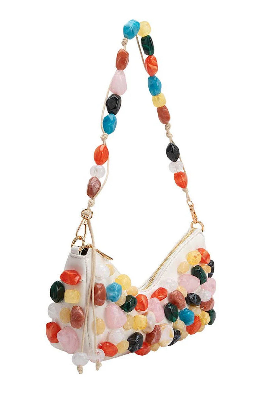 Elevate your look with Rhodes, a convertible shoulder bag decorated with Baroque stones. Detach the strap to reveal a butterfly-inspired clutch, ideal for elegant evenings and statement-making style.