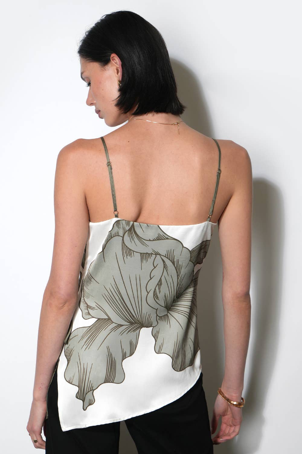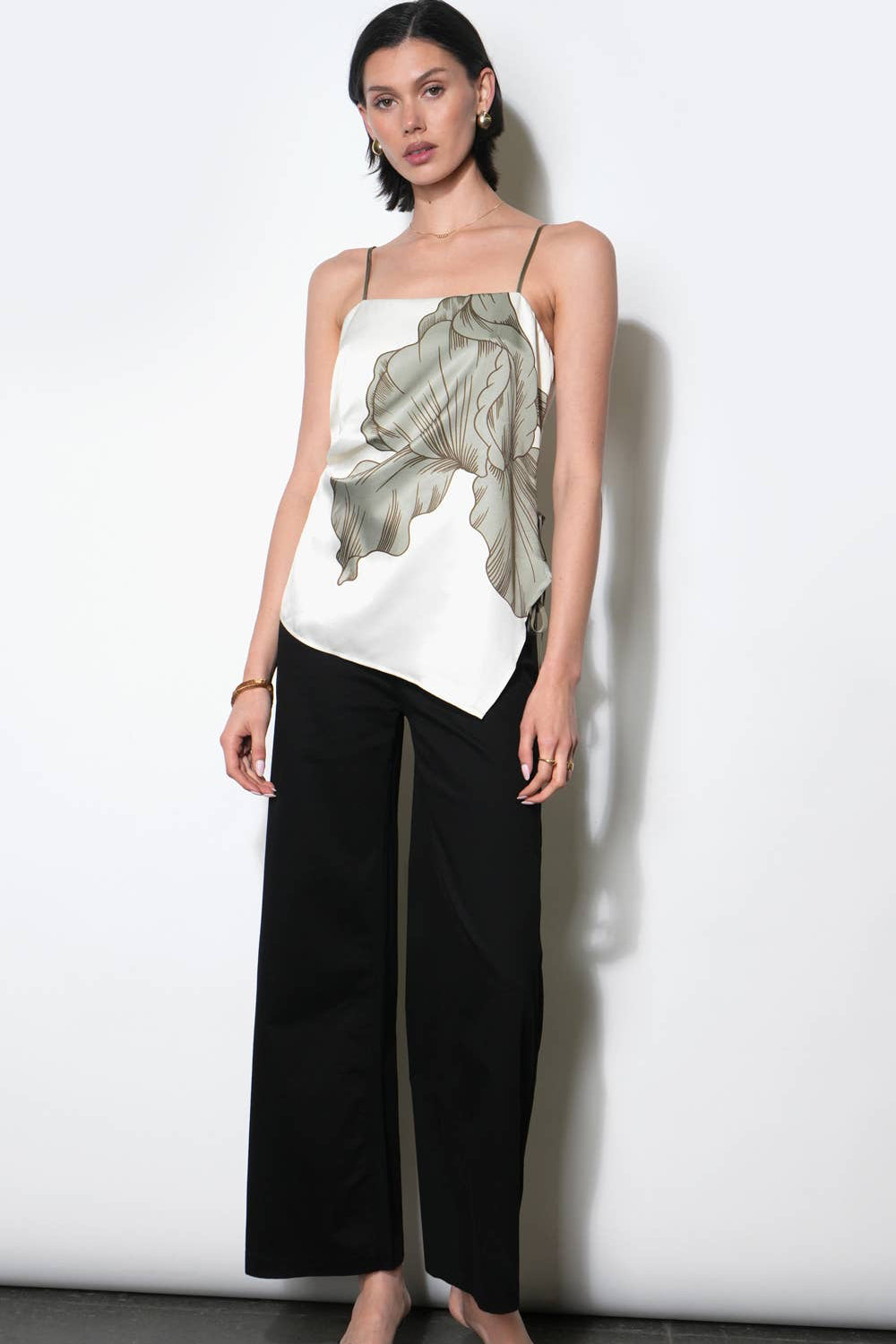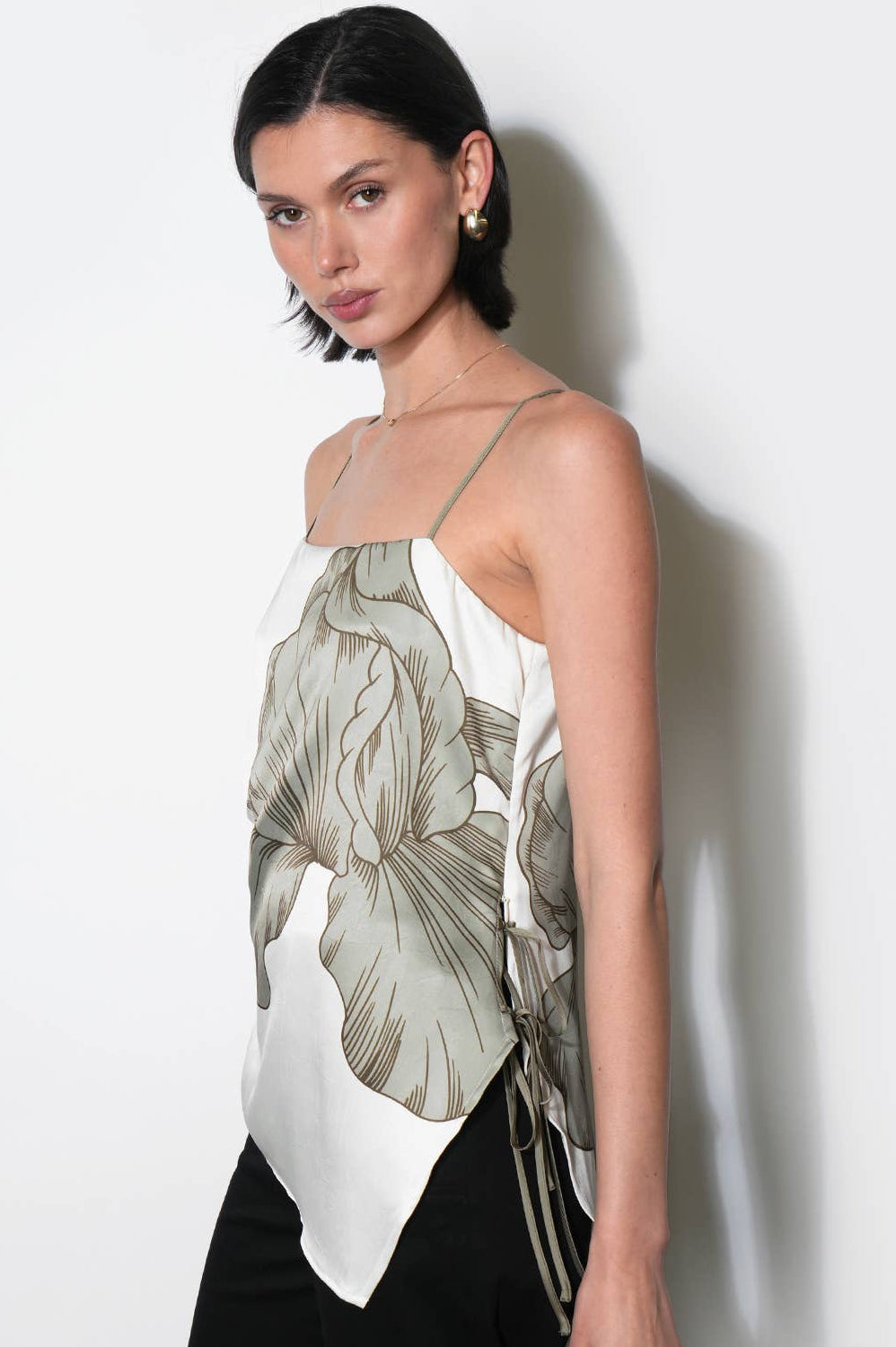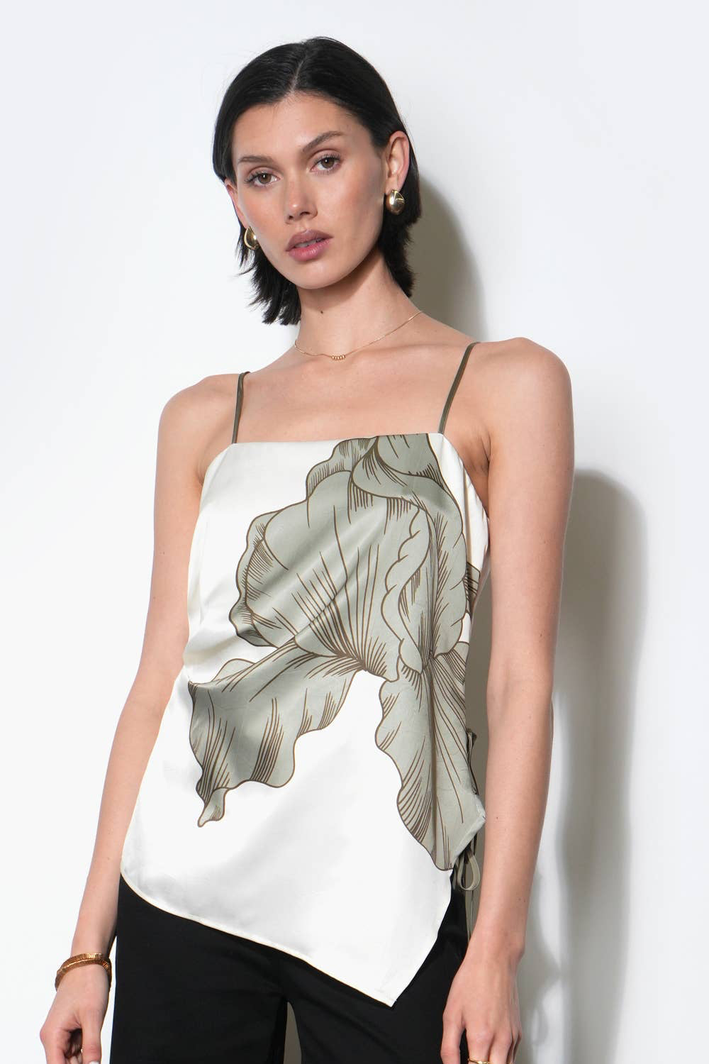 Presented in the sophisticated combination of Ecru and Olive, this top is likely crafted from a soft, flowy fabric, possibly satin or rayon. Its defining characteristics are the asymmetric silhouette, which provides a modern edge, and the side tie detail, which allows for an adjustable fit and adds a subtle point of interest at the waist or hip.