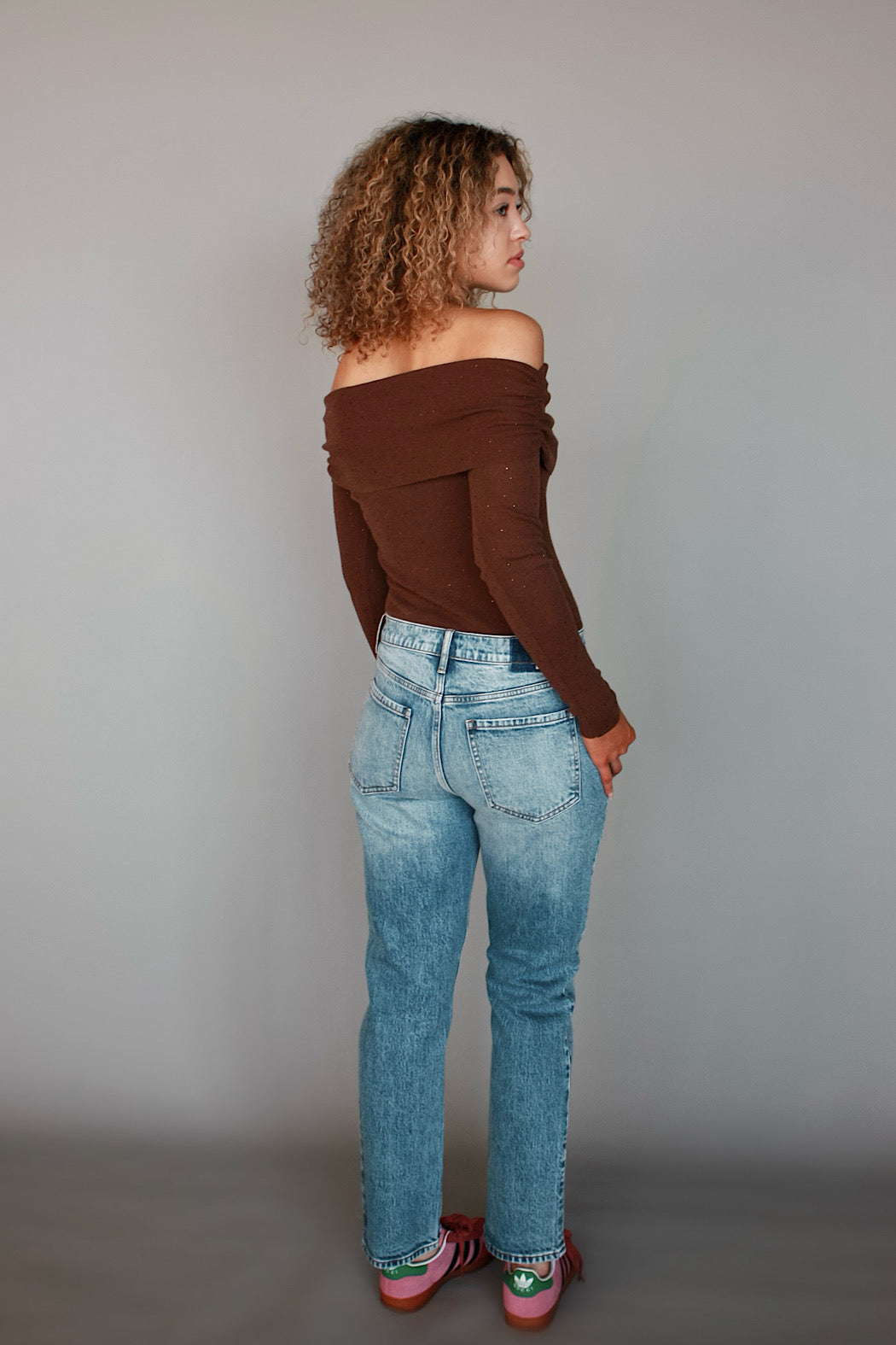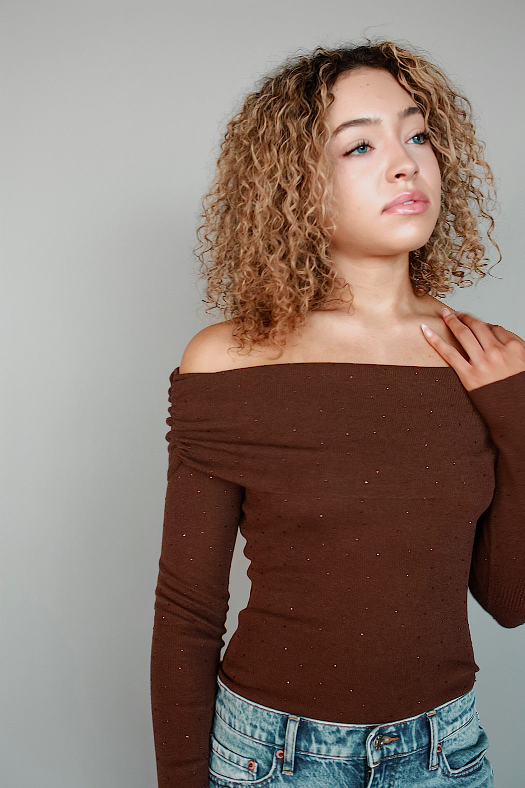 This sophisticated long sleeve knit top showcases an elegant off-shoulder design enhanced with meticulously applied hot fix rhinestones throughout. The fold over neckline and ruched side detailing create a flattering, contemporary silhouette that transitions seamlessly from casual to evening wear. Whether paired with tailored mini shorts for a bold daytime look or styled for an intimate dinner, this statement piece delivers versatile glamour with refined craftsmanship.