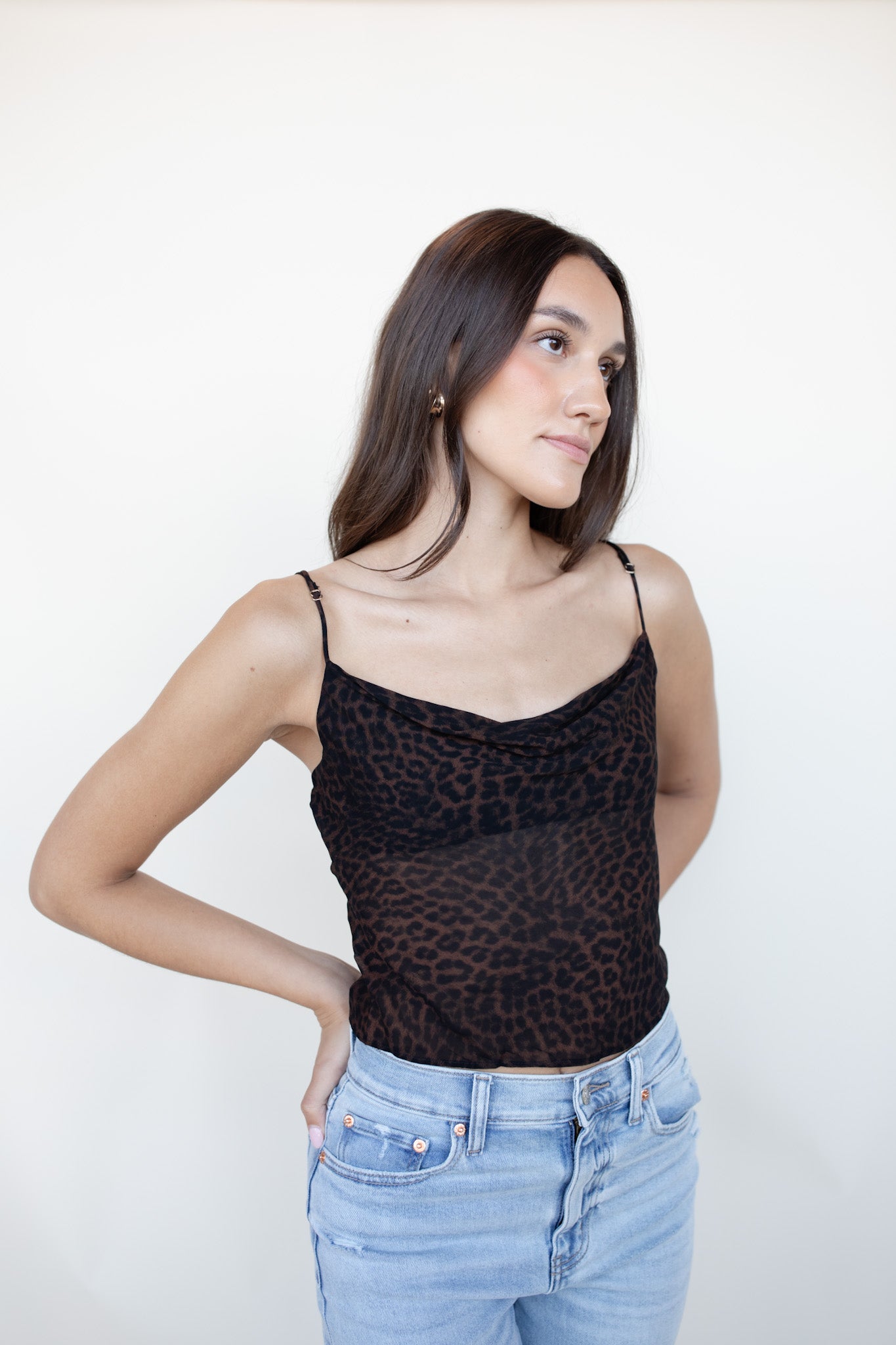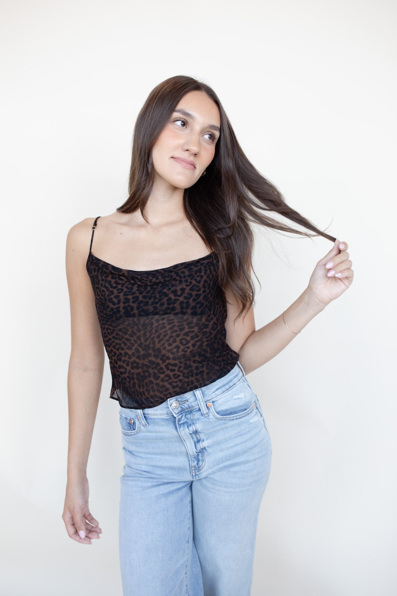 Channeling the spirit of ’70s rock icons, blending elegance with the edgy vibe of a disco dive bar. Crafted from semi-sheer viscose georgette, it features a draped cowl neckline and delicate adjustable straps that contour the body effortlessly. Its leopard print adds a bold, untamed touch, perfectly balancing sophistication with a hint of wildness..