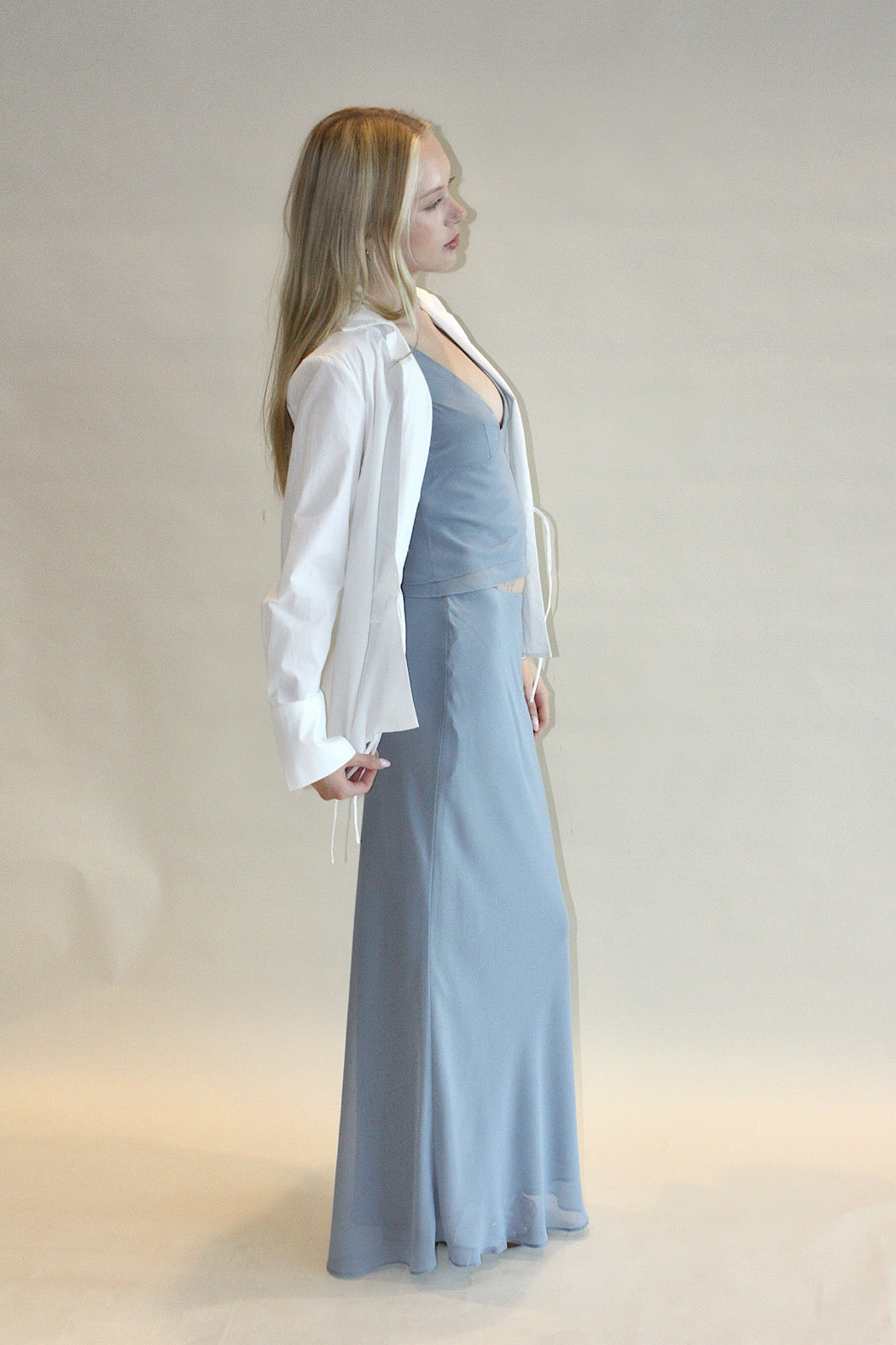 90's vibe maxi skirt with a clean finish, flowing into a sleek, bias-cut silhouette that drapes softly along the body. Designed in a lightweight fabric with an invisible side zip, it’s an easy statement on its own—and pairs perfectly with the Deep-V Top.
