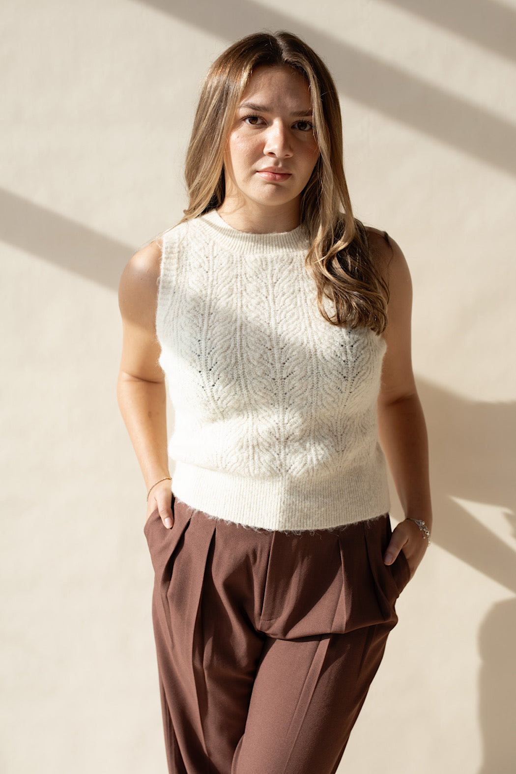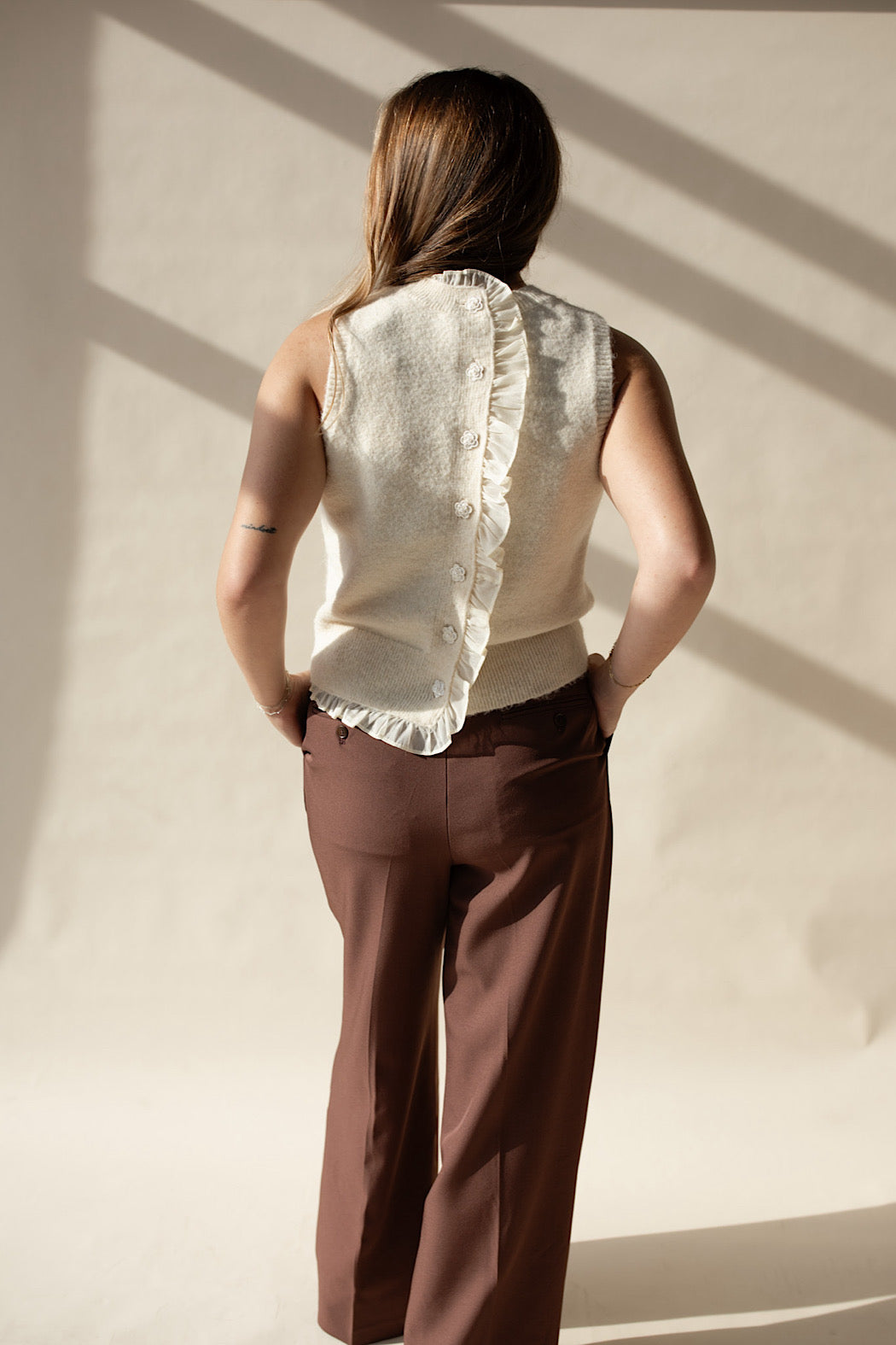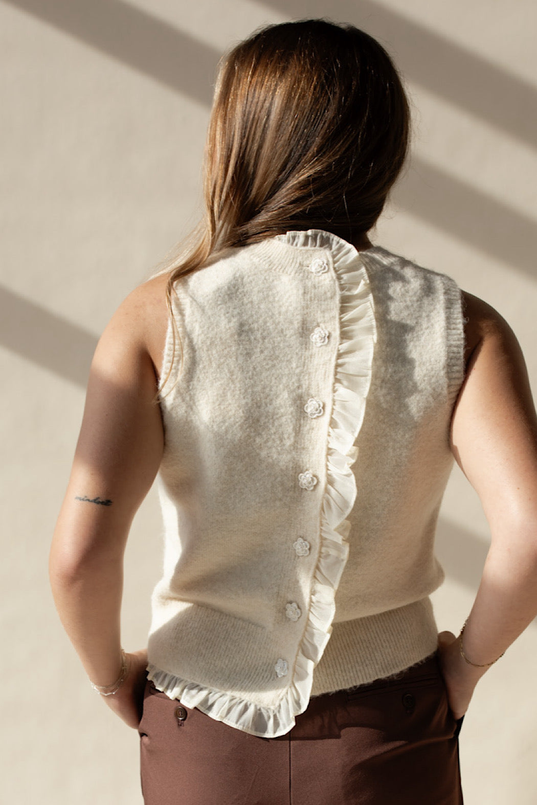 This cable knit sweater tank features a contrasting ruffle trim along the back placket and a functional pearl flower button closure. It is finished with ribbed detailing on the neckline, hemline, and sleeve cuffs, complemented by a soft brushed knit texture for added comfort.