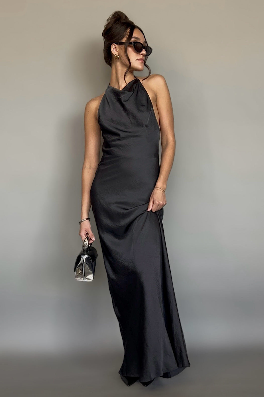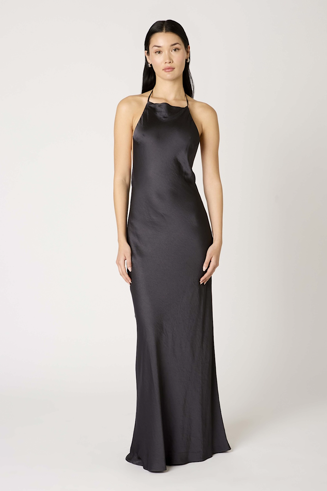Discover understated elegance where minimalist design meets luxurious draping. This sophisticated maxi features a refined high neckline with customizable neck and back ties, creating an effortlessly chic aesthetic. The dramatic open back provides striking contrast to the streamlined front, while lustrous satin fabric shimmers gracefully with movement. Perfect for warm-weather occasions that call for polished, romantic style—a versatile piece that transitions seamlessly from intimate gatherings to upscale events.
