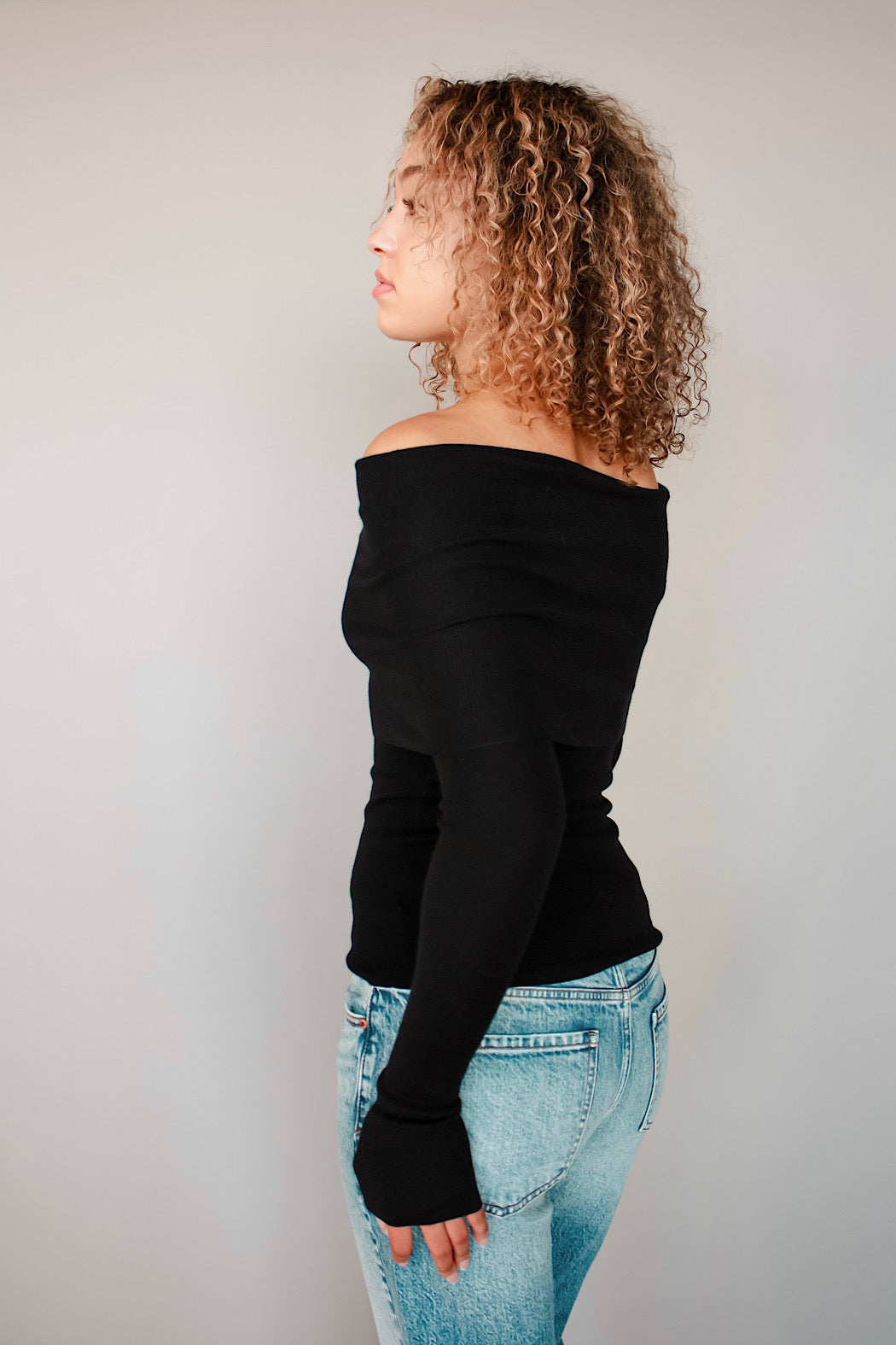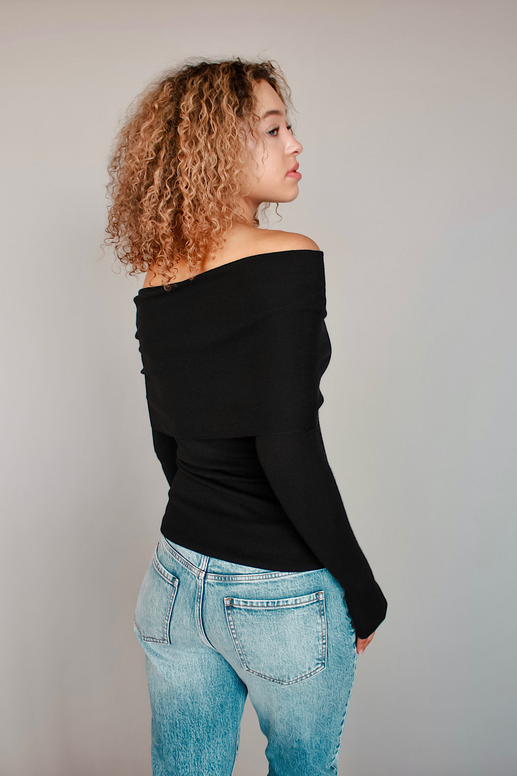 This refined sweater showcases an elegant off-shoulder silhouette with a graceful fold-over neckline that accentuates the collarbone while maintaining a streamlined aesthetic. Crafted from textured ribbed knit, it offers a tailored, form-fitting cut without lining for effortless layering and movement.