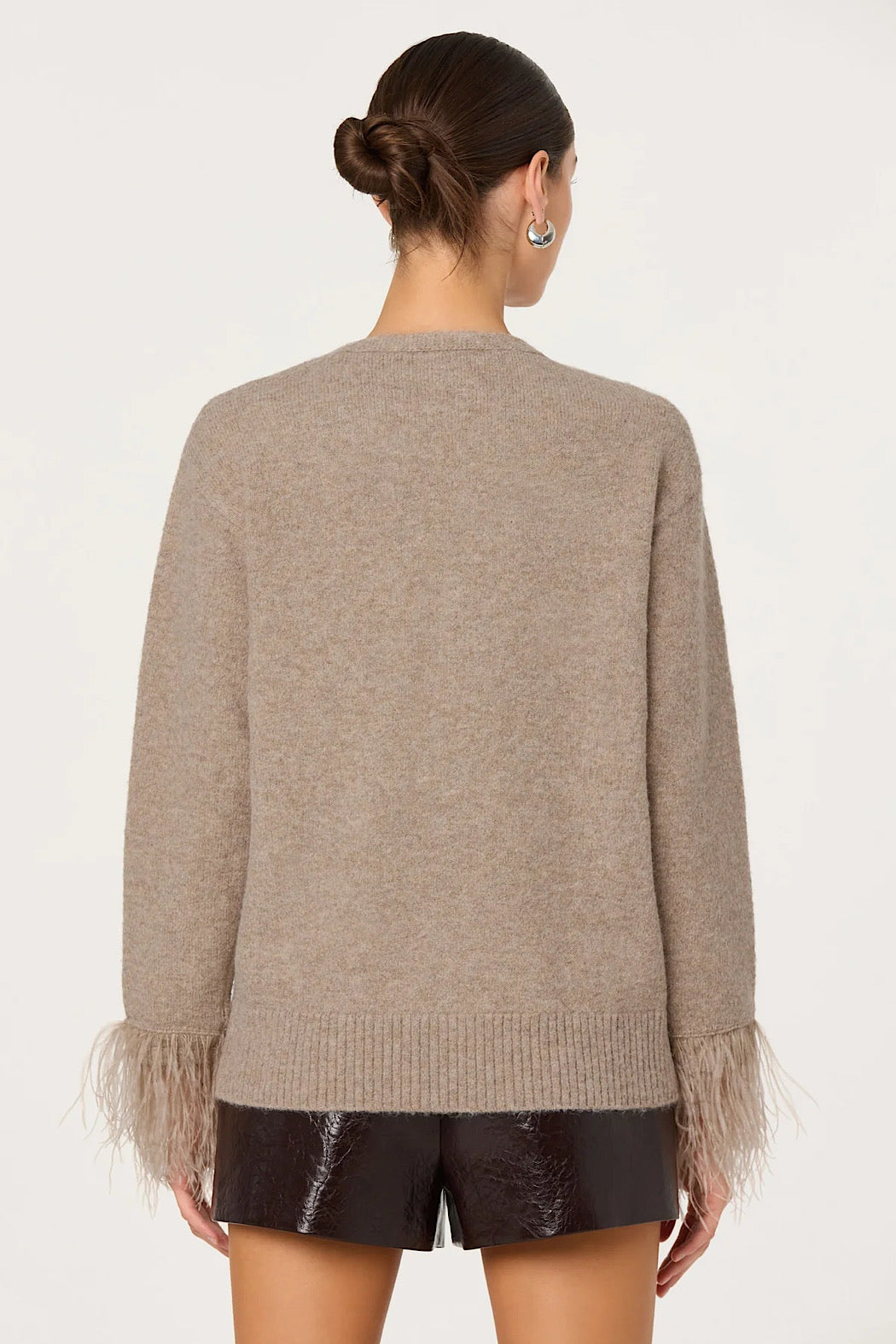 Elevate your everyday wardrobe with this refined cardigan that seamlessly blends elegance and comfort. Crafted from soft brushed knit with a flattering V-neckline, this piece features luxurious feather-trimmed cuffs and rhinestone embellishments that add understated glamour. Whether layered for the office, styled for brunch, or worn casually at home, this versatile cardigan delivers polished sophistication with every wear.