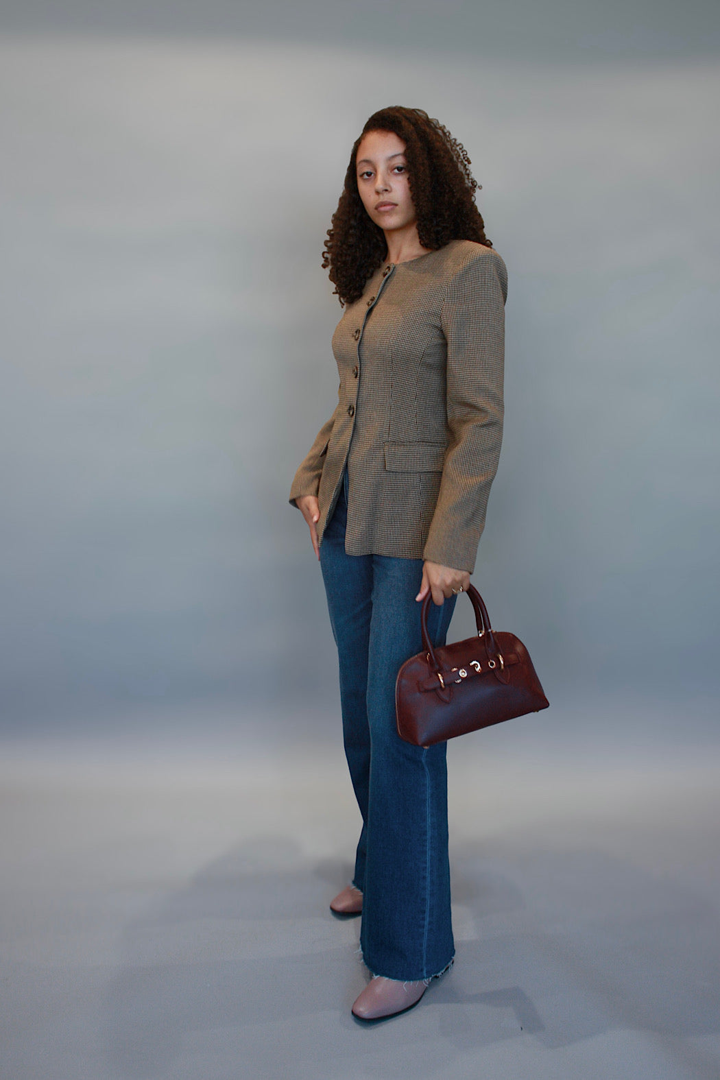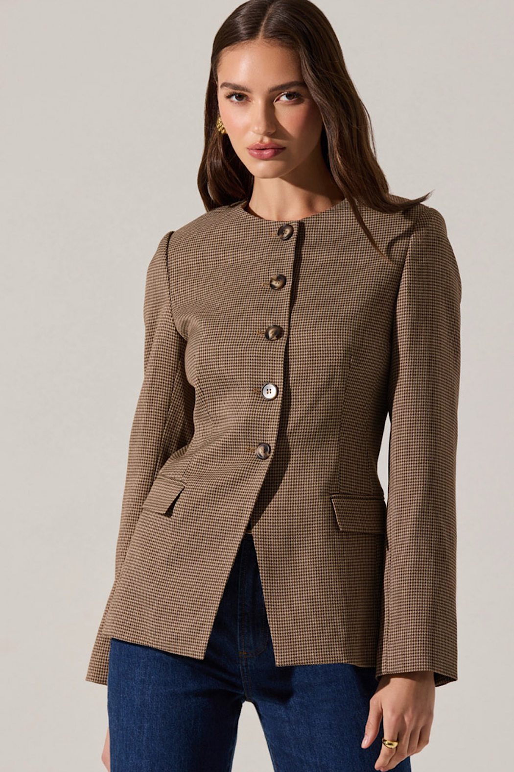 This fitted blazer is a must-have for your professional wardrobe—sleek, adaptable, and perfect for a sophisticated business casual style. Wear it with jeans for a chic, easygoing outfit or combine it with a sophisticated trouser for a complete, elegant ensemble. Features include practical front pockets, structured shoulder padding, a tailored tapered collarless design, full lining, and button closures at the front and sleeve cuffs.