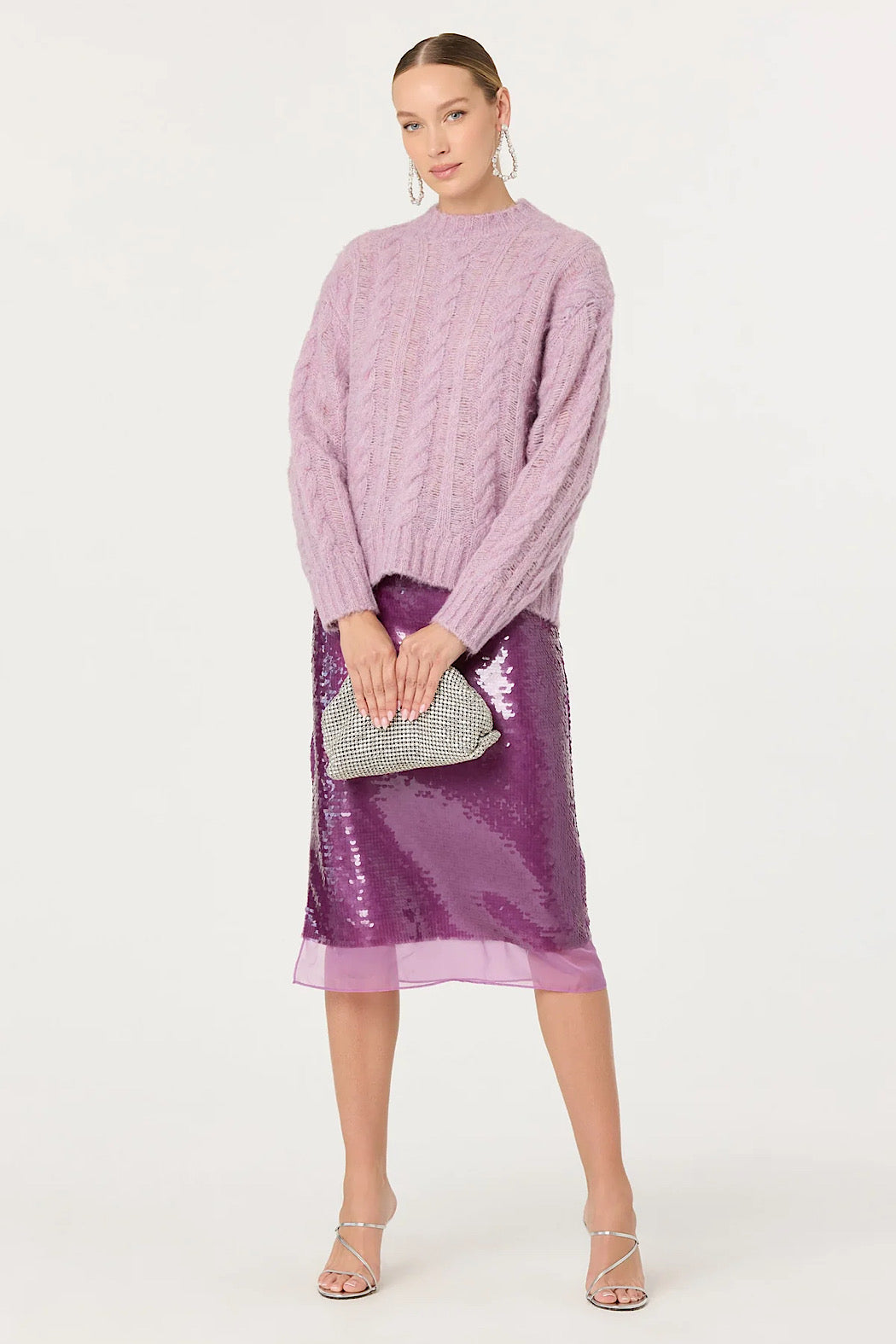 Pair this sequin midi skirt with this coordinating Violet Sweater for understated elegance or layer it beneath a tailored blouse to create a polished holiday look. Crafted as a fitted pencil silhouette, it features delicate lace detailing at the waistband and a fully lined construction with an extended sheer slip for seamless layering and movement.