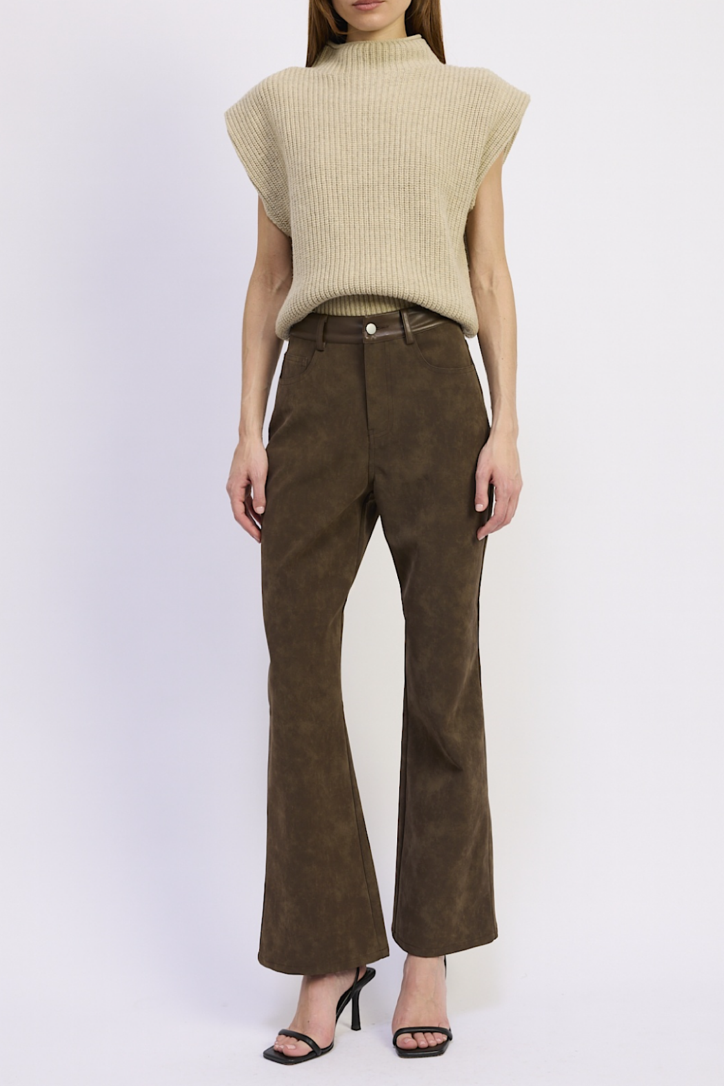 Expertly made from a combination of vegan leather and suede, these flared pants can effortlessly transition from office attire to evening wear. Coordinate with a cozy knit for a relaxed look or pair with a sophisticated going out top to dance the night away.