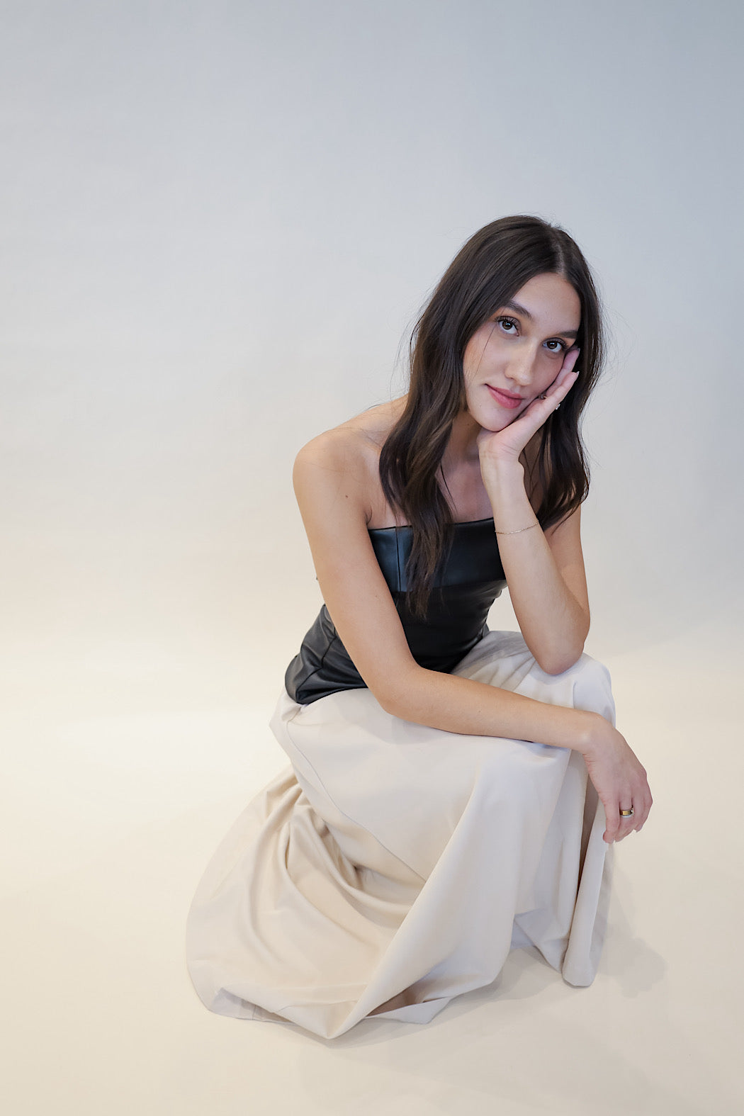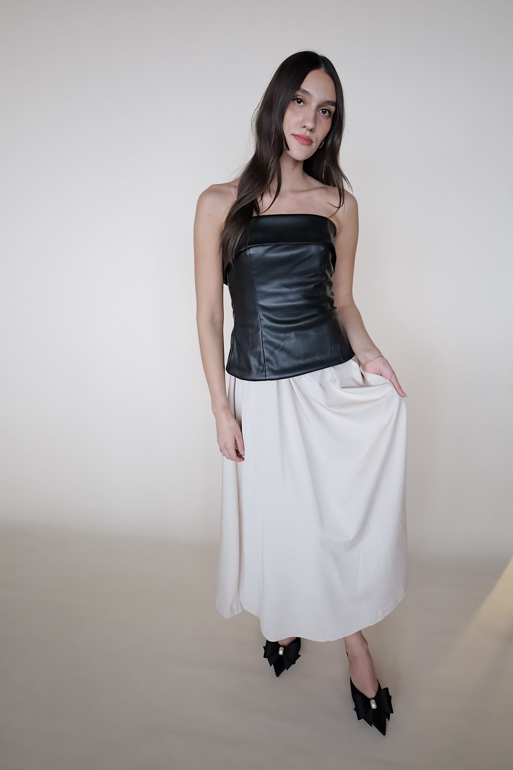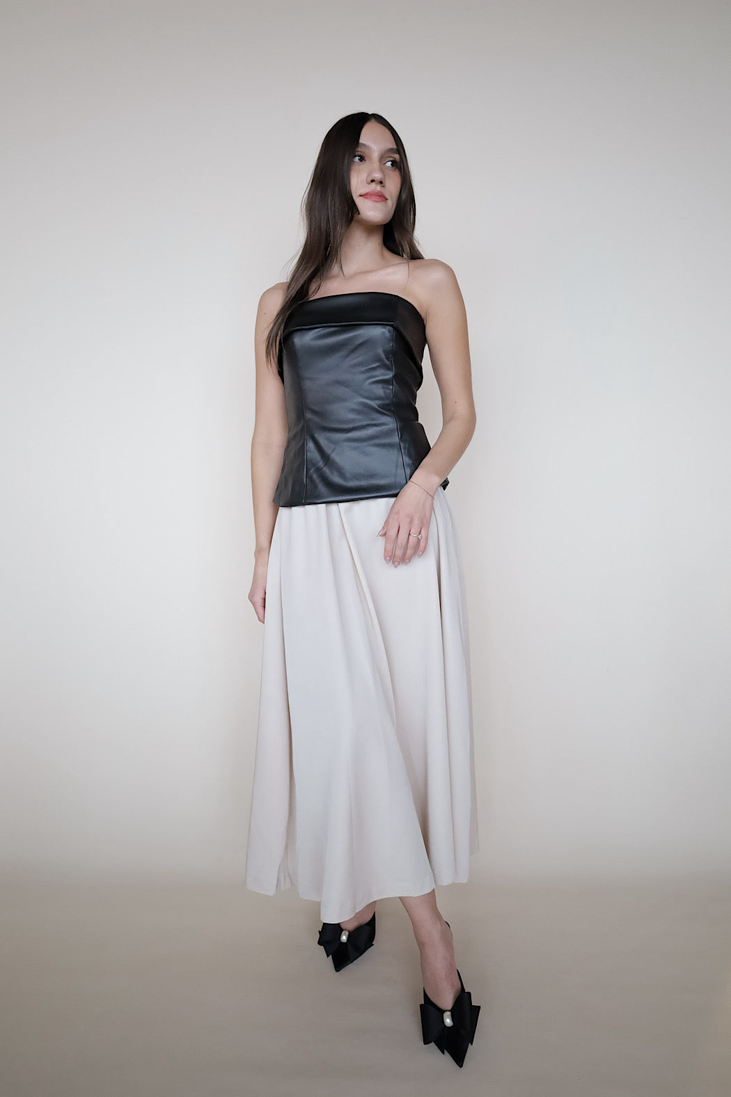 This sophisticated midi dress combines premium mixed-media construction with refined tailoring. The structured bustier bodice features a luxurious blend of Tencel and Spandex, while the skirt showcases a balanced polyurethane and polyester composition for optimal drape and movement. The fold-over neckline adds architectural interest to this versatile piece. Fully lined in polyester for comfort and durability. Hand wash recommended to preserve fabric integrity. Imported design. Model pictured is 5'9" wearing size small.