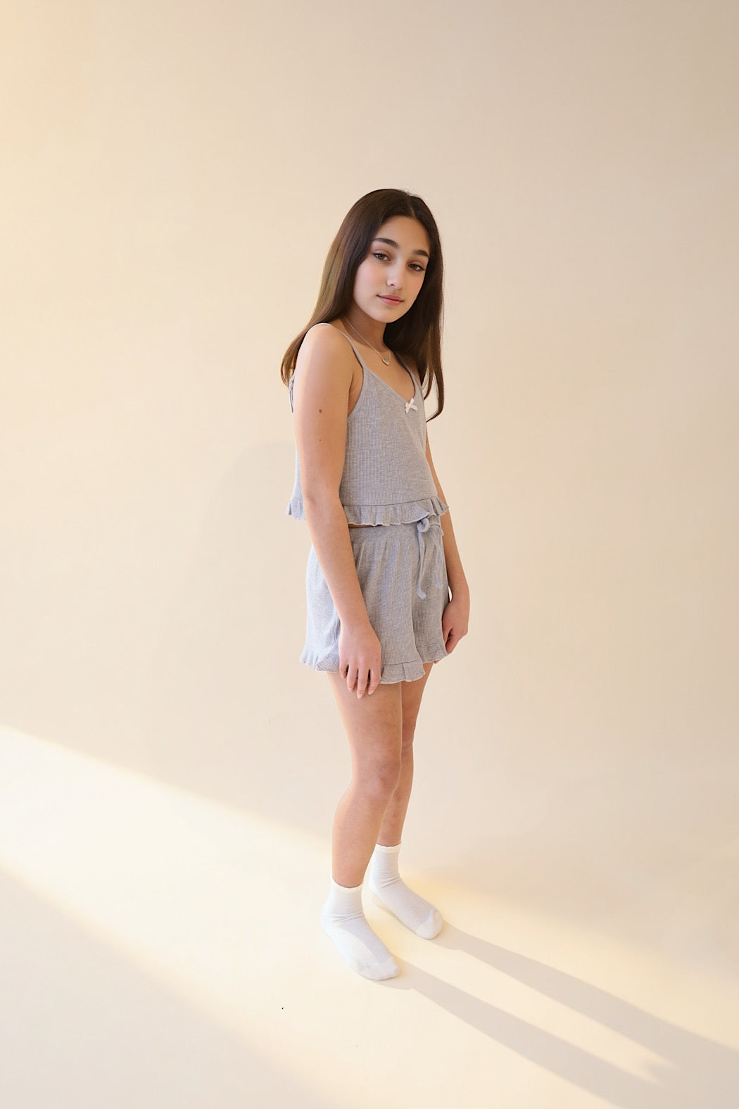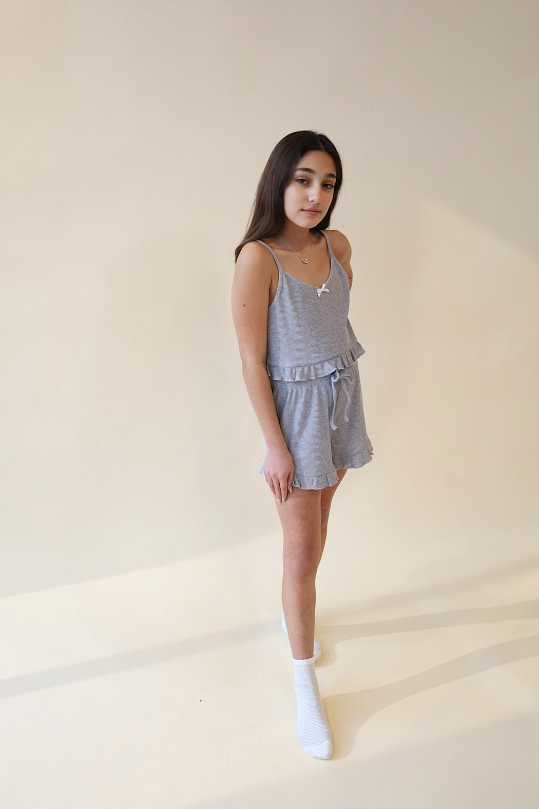 Snuggle up in style with this adorable grey Ruffle Ribbed PJ Set designed for tweens who love comfort with personality. The soft, ribbed fabric hugs gently against the skin while charming ruffles bring a dash of flair to bedtime. Whether your tween is winding down for sleep or lounging around, this set delivers all-night coziness without compromising on cute.