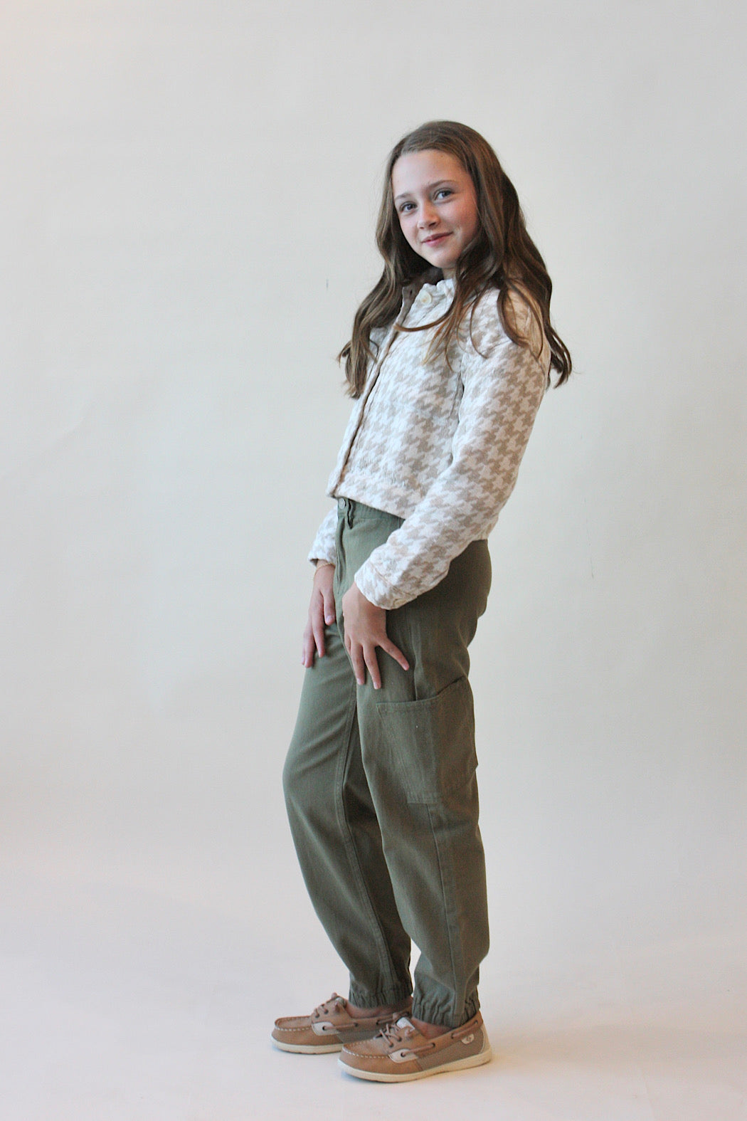 This stylish, oversized jacket features a classic houndstooth pattern in neutral, timeless tones with a boxy fun shape and slightly cropped style.