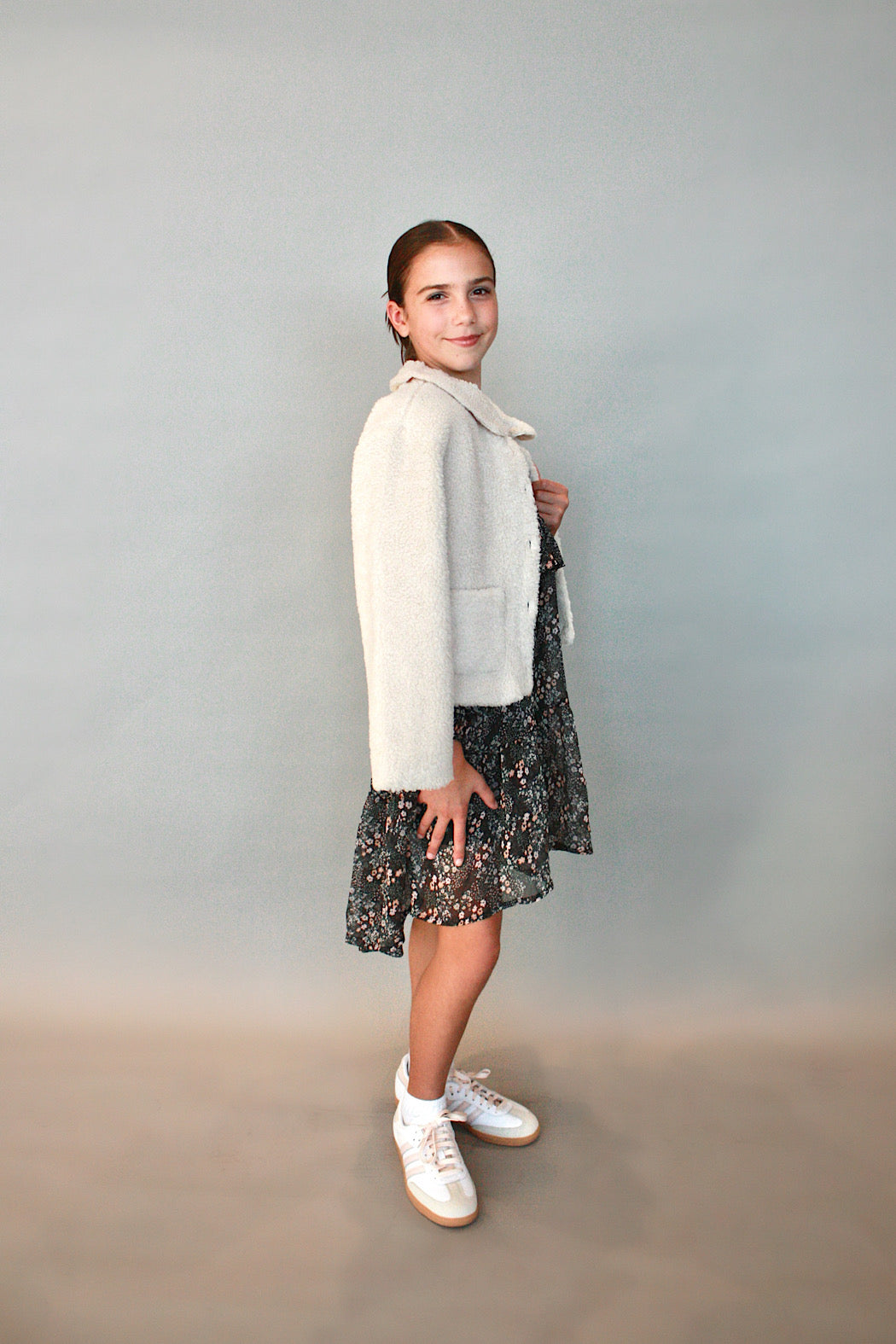 A beautiful layer of warmth and sophistication with a touch of girly feminine vibes, she will love this jacket to layer over all her Fall and Winter looks! Perfect for the holidays and can be dressed up or down!