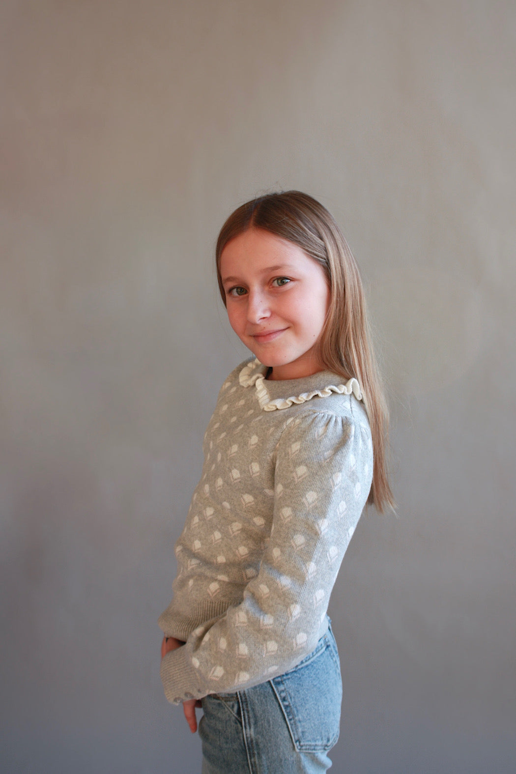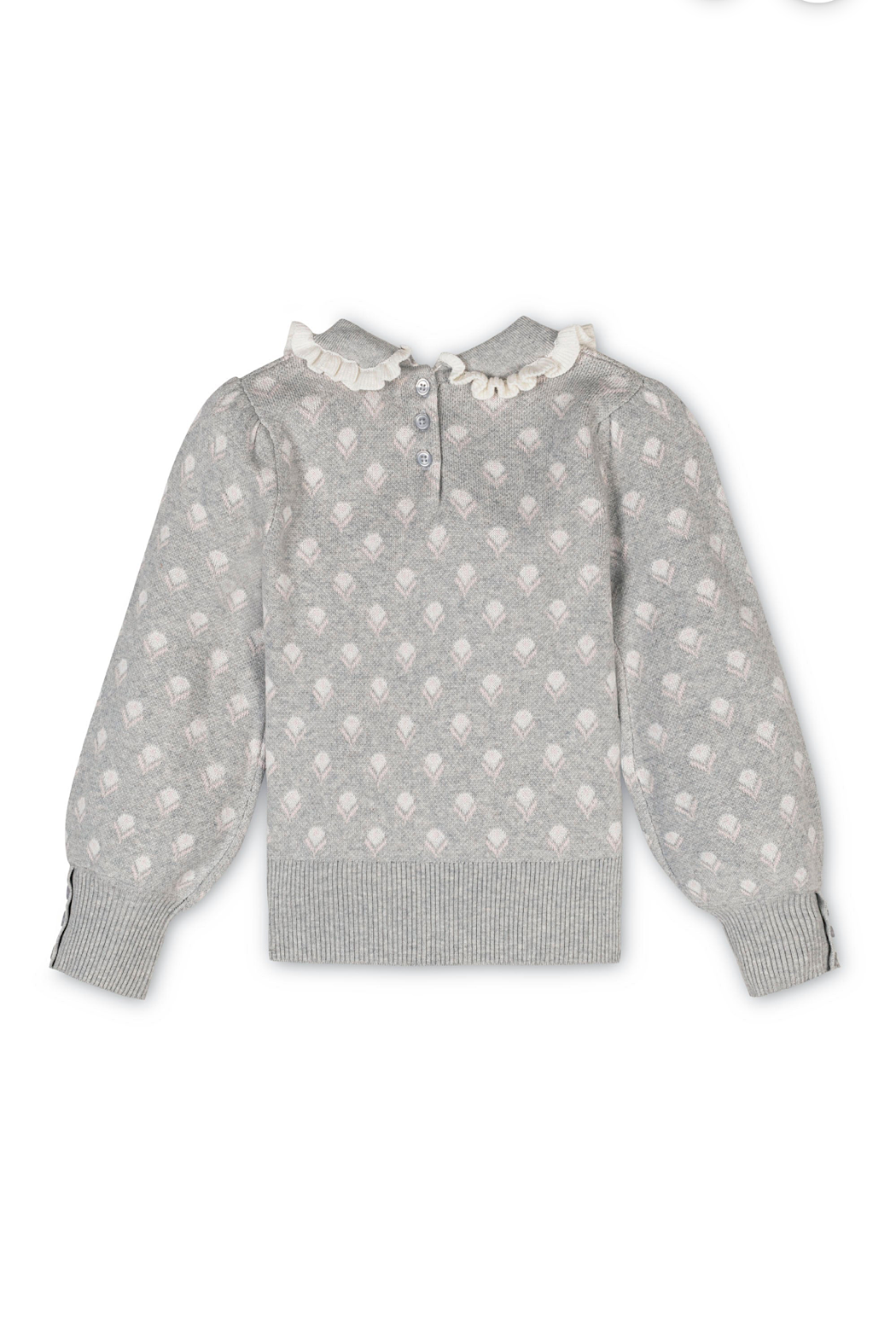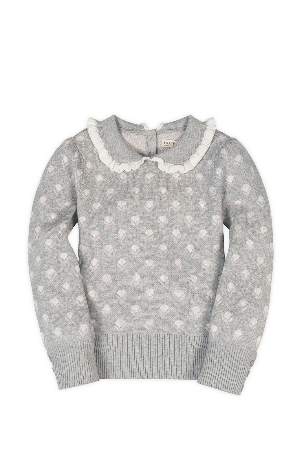A standout of the season is Hope & Henry peter pan collar sweater crafted from soft organic cotton. Features feminine bell-shaped sleeves, a knit peter pan collar with ruffle detail, and a button closure at the back neck for easy on and off.