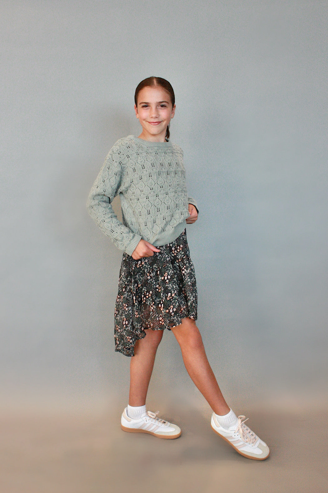 Elevate her style with this super cute geometric textured knit sweater that is perfect hue of a dusty sage green, gorgeous with denim, leggings or dress it up and put it over her favorite dress!