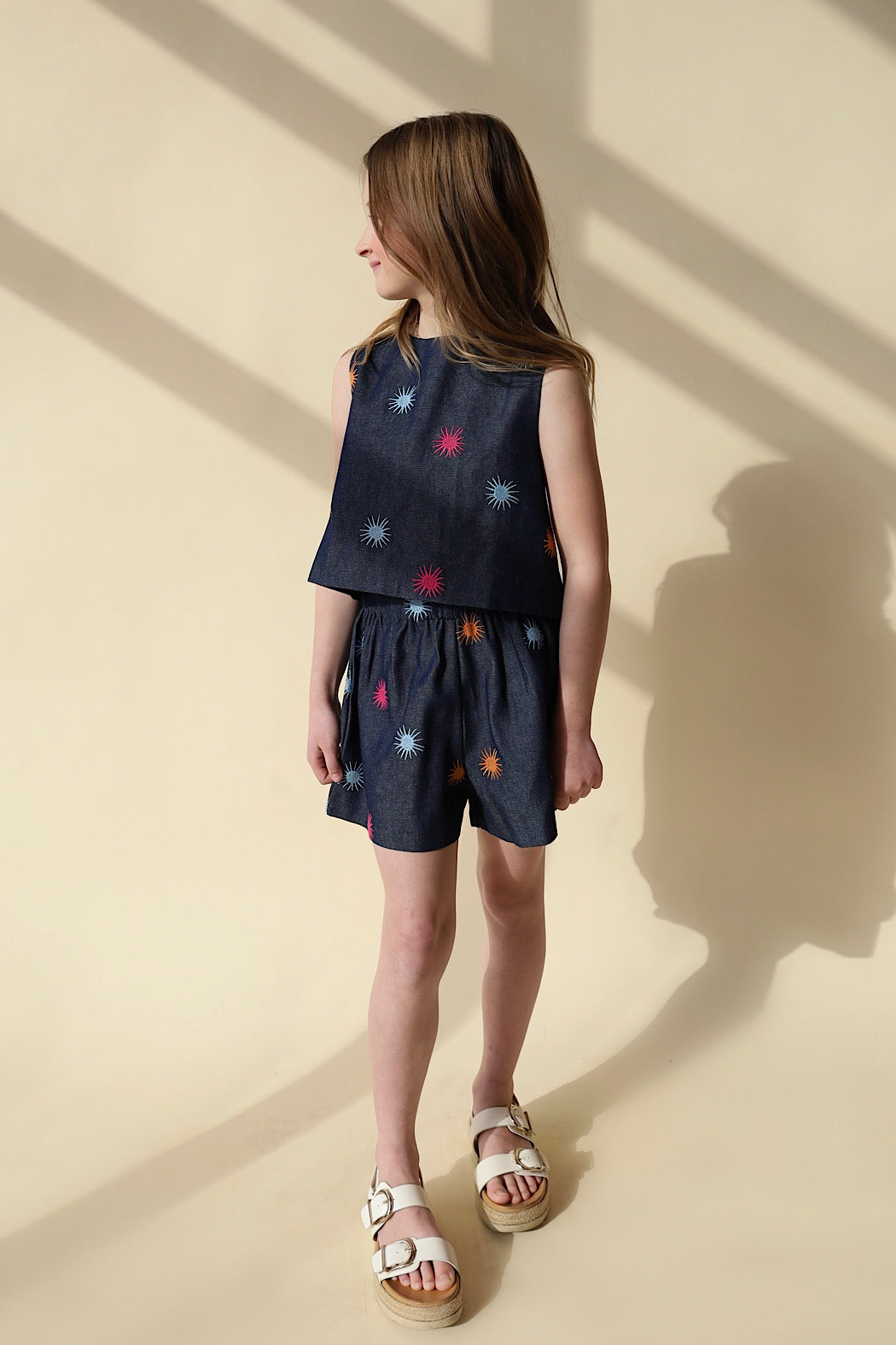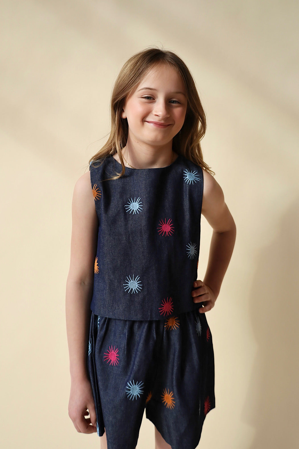 MaMeet Stella—the denim top that's as fun as it is fabulous! Handcrafted by skilled artisans in Colombia, this playful piece is designed for girls ages 8-14 who love making a statement. Pair it with the matching shorts for an effortlessly cool, head-turning look that celebrates individuality and style.