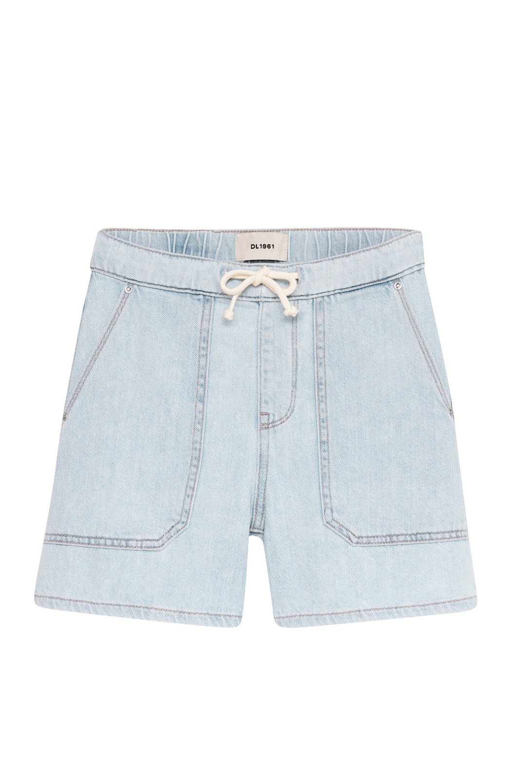 This DL1961 classic Bermuda short style fit is a perfect fashion forward piece for daily wear. Poolside Drawcord is a super light indigo wash with a faded look. It features an ecru cotton drawcord, silver hardware, khaki stitching and a clean hem.