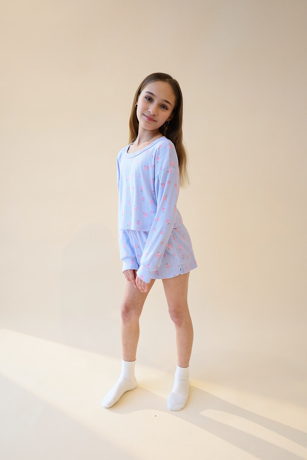 Your tween will love slipping into this laid-back lounge set that's as fun as it is functional. The matching long sleeve top and leggings create an effortlessly put-together vibe, whether she's heading to class, catching up with friends, or chilling at home. Crafted from soft, stretchy fabric that bends and moves with her, this set keeps comfort front and center without sacrificing that sleek, modern edge. It's the perfect go-to for any day of the week.