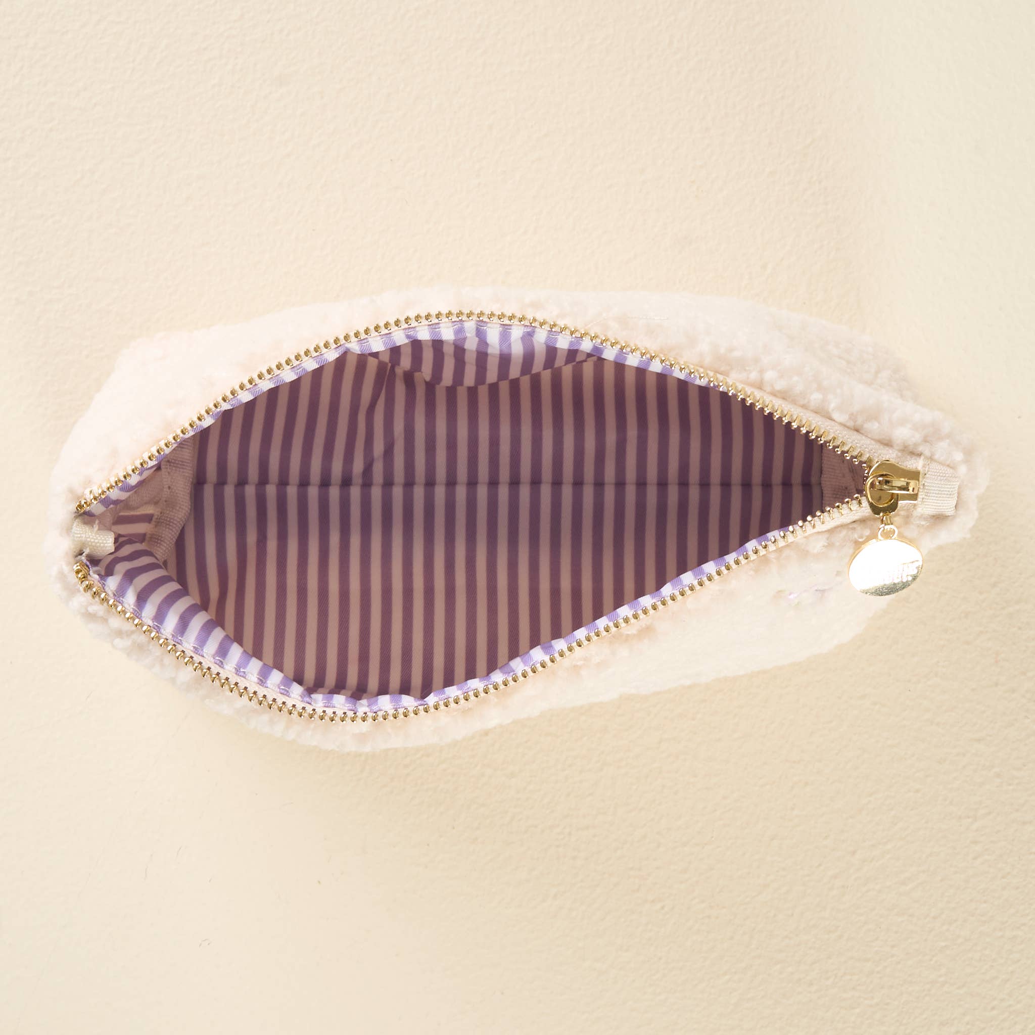 Add a cozy touch to your essentials with these pretty and cute teddy pouches. Crafted from soft sherpa fabric, these pouches feature a wipeable lining for easy cleaning and gold zippers and hardware for a polished look.