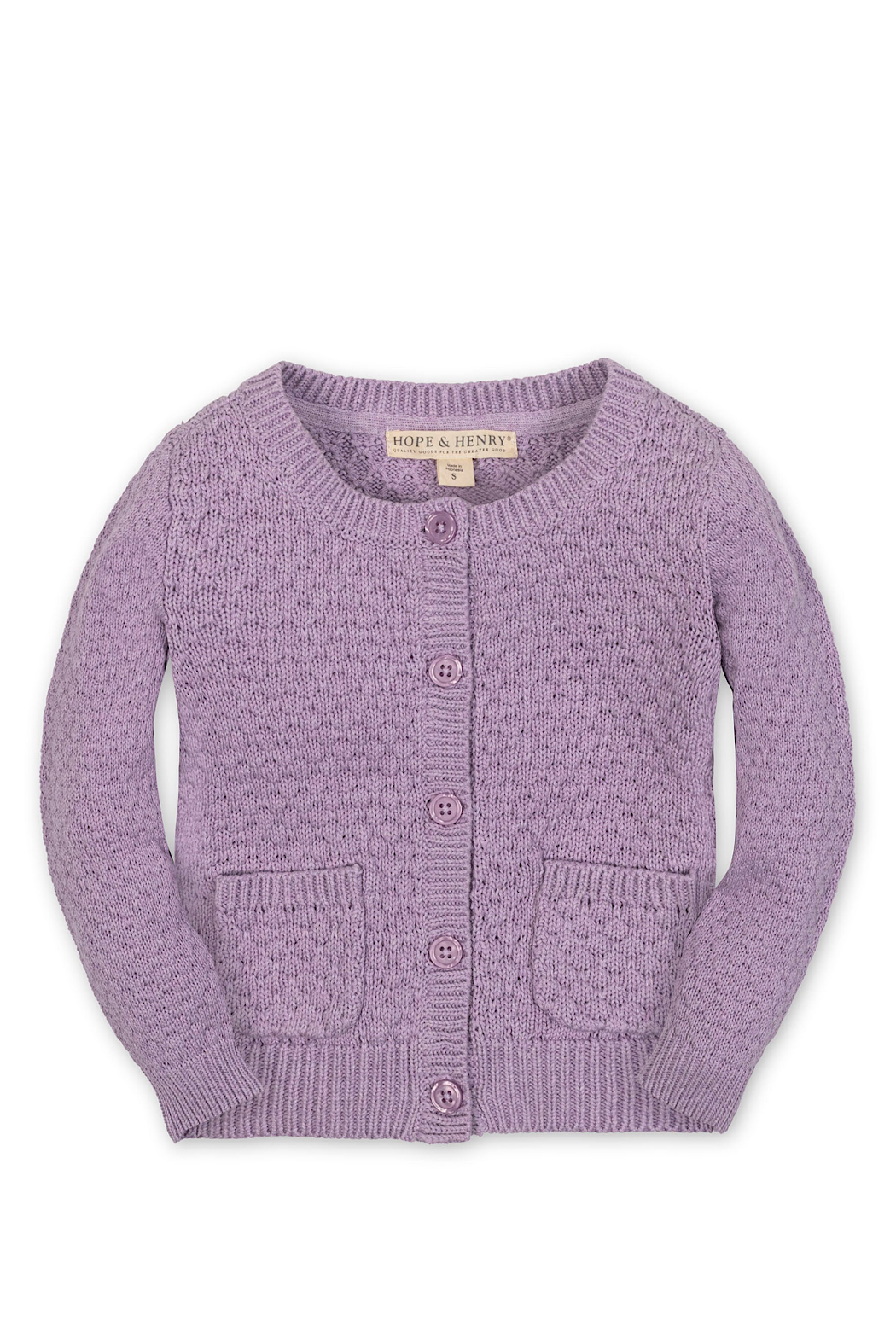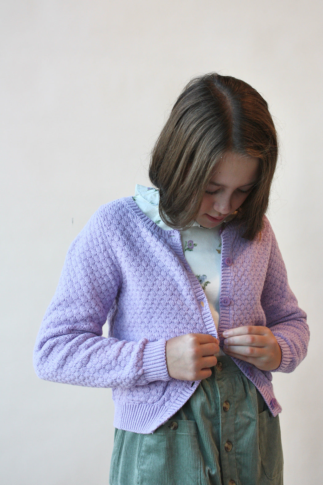 This timeless cardigan design crafted from soft organic cotton stands out with an intricate allover textured stitch. It includes a button-front closure and convenient front patch pockets. Perfect for layering, shop the entire look here TOP & SKIRT
