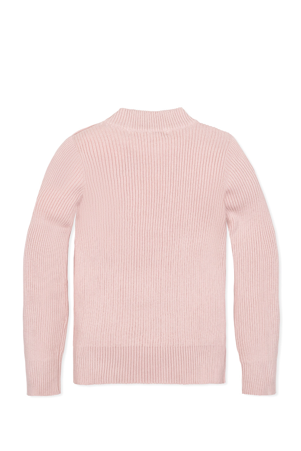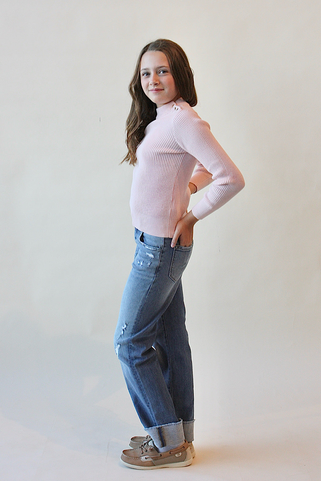 This elegant long-sleeve mock neck sweater made from soft organic cotton offers your Youth a polished look for the fall and winter months. Crafted in a stretchy rib knit, it features a mock neck accented with gold buttons and ribbed edges. Ideal for pairing with skirts, jumpers, and leggings for a complete, comfortable outfit.