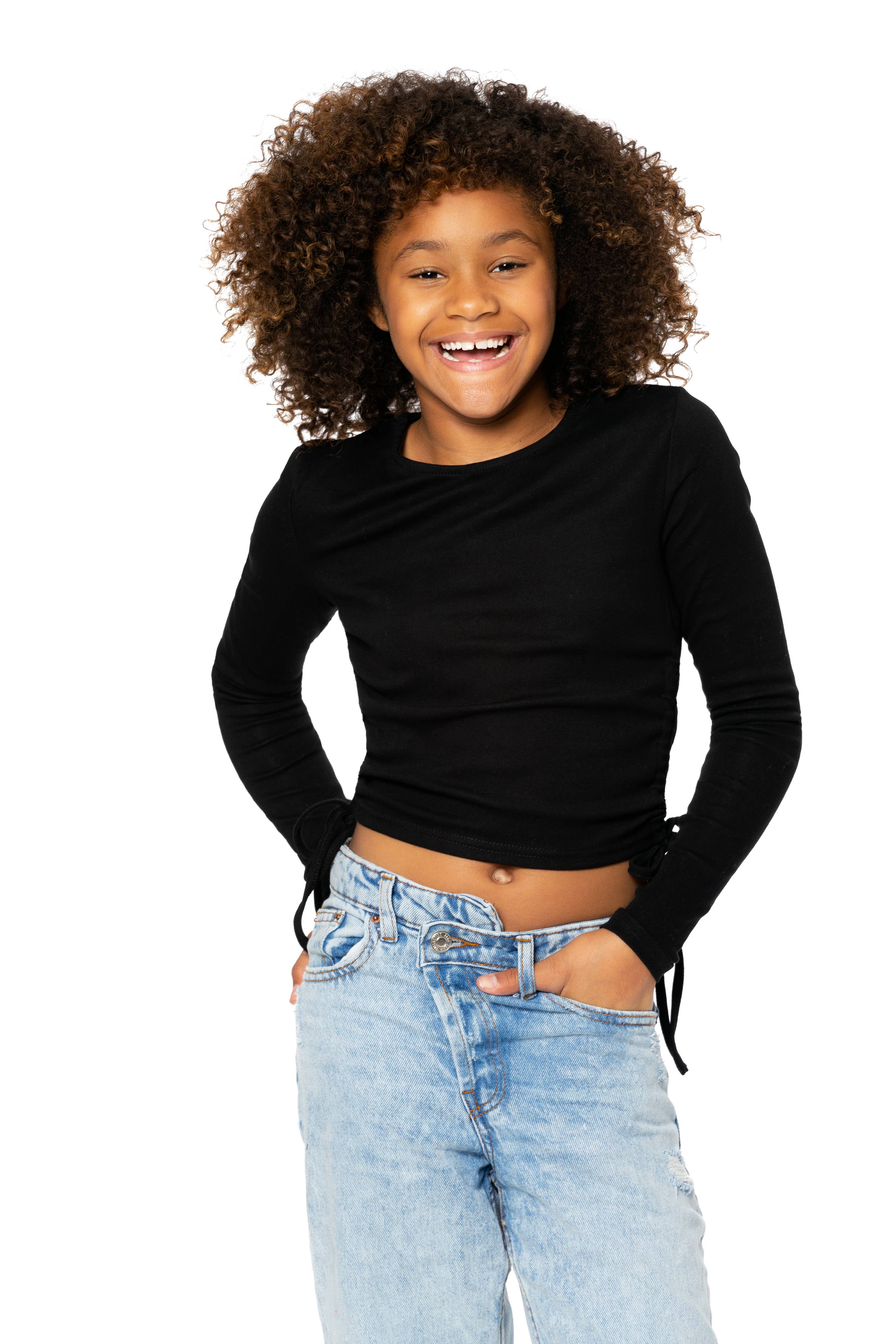 This super soft top has ruching and a tie on the side for the prefect amount of detail. This is a great versatile top to pair with a skirt or denim.