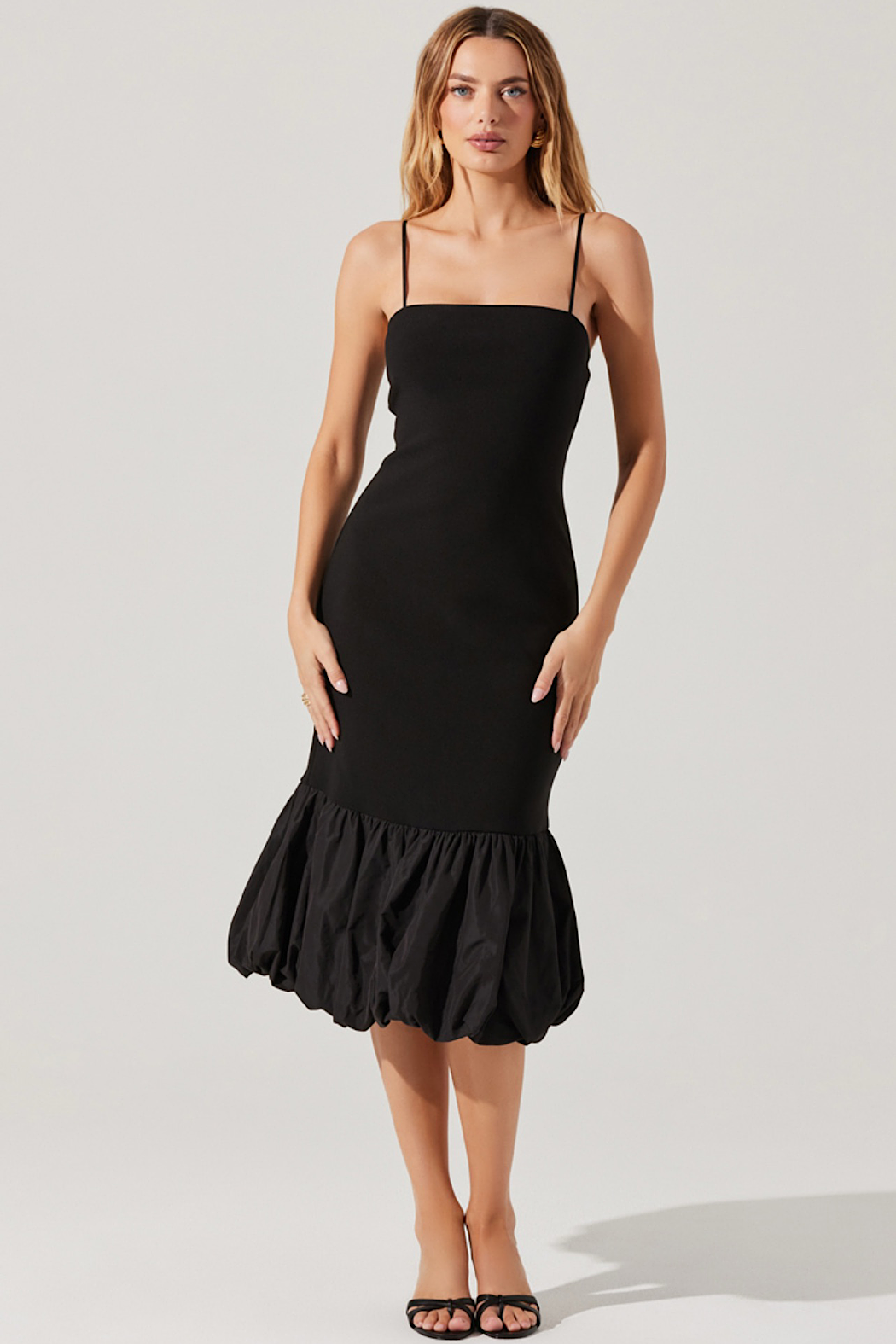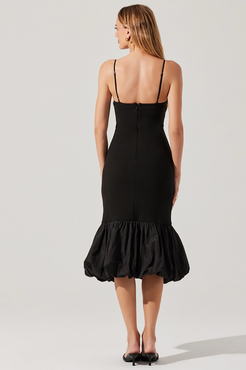 This midi-length bodycon dress features a bubble hem and a square neckline. It includes adjustable spaghetti straps for a customized fit, is fully lined for comfort, and has a concealed zipper at the back for a seamless look.