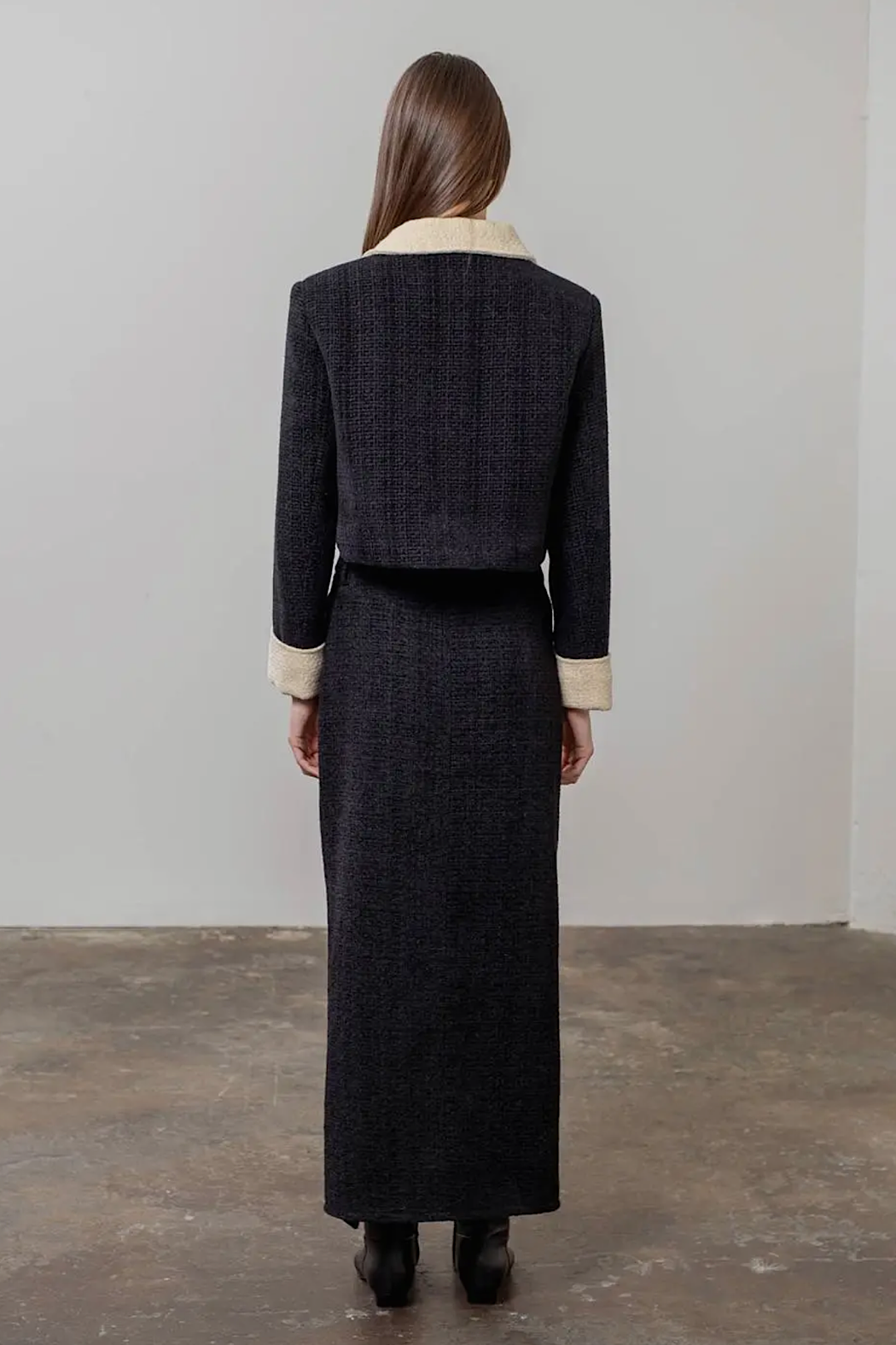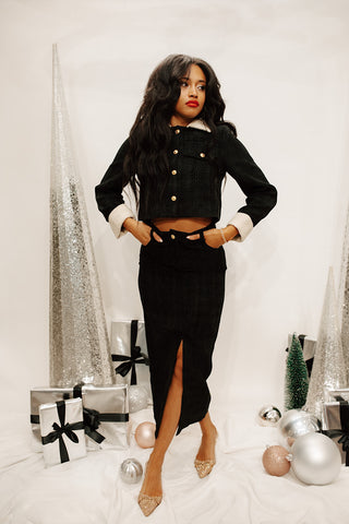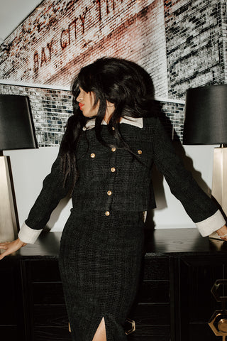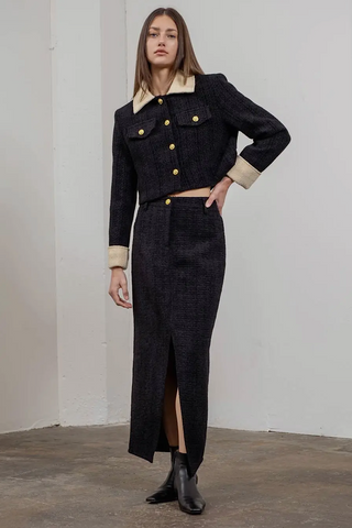 This gorgeous, lush midi skirt with tweed like fabric comes lined and has a flattering sleek sit with golden button closure. Get the perfect look by adding the MATCHING JACKET. It's giving Chanel Vibes!