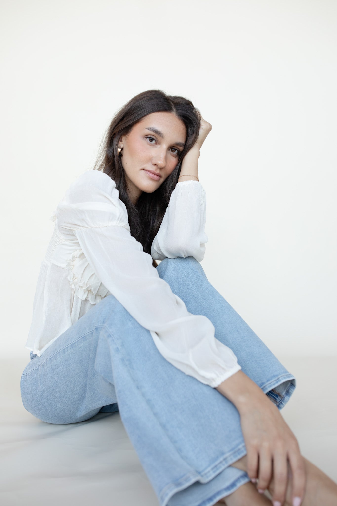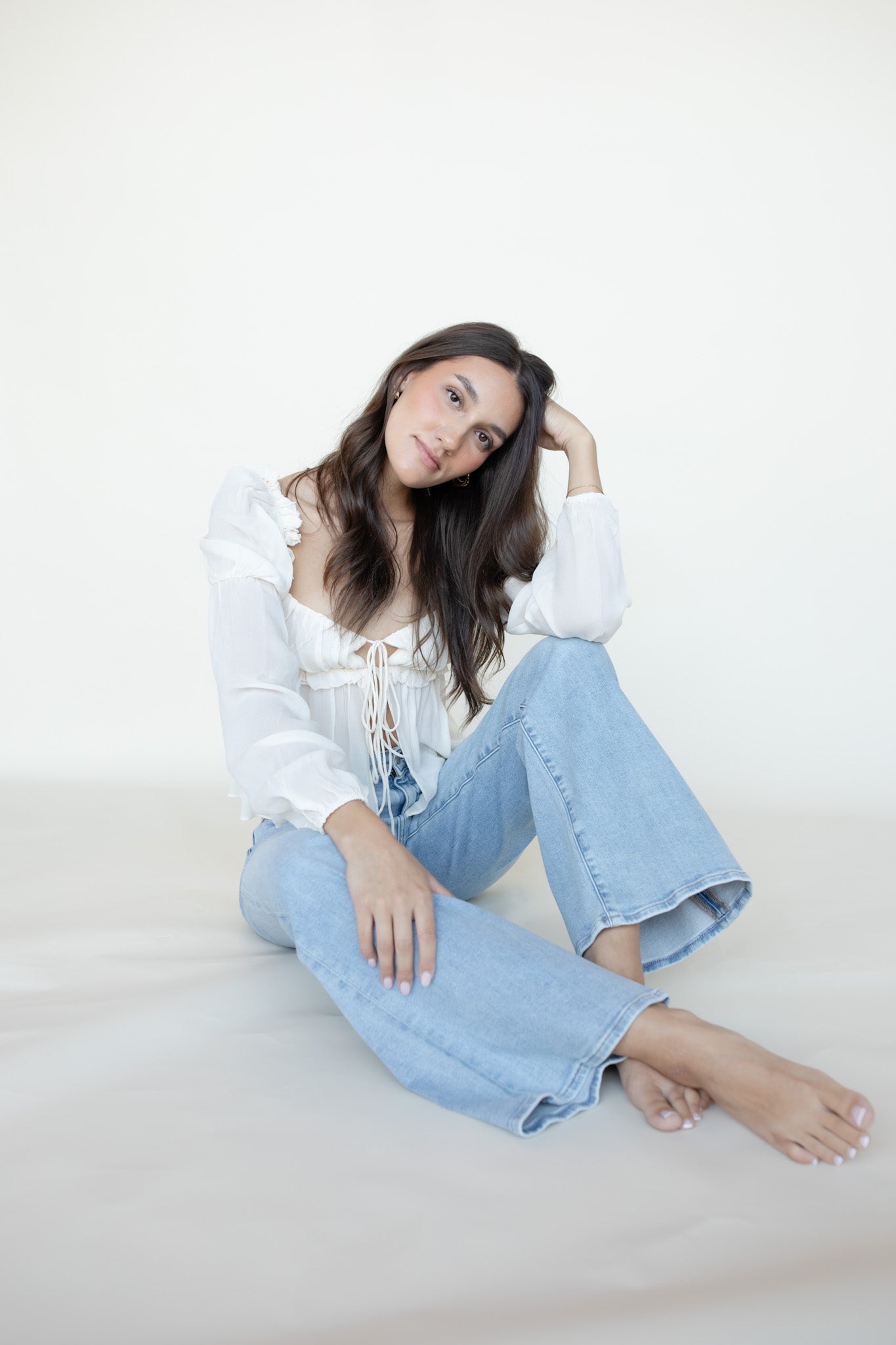 This vintage-inspired softness top with contemporary design, features a gathered bust, flowing bishop sleeves, and delicate micro ruffle detailing. Crafted from semi-sheer georgette, it exudes an airy, ethereal quality. The smocked back and adjustable ties ensure a comfortable, adaptable fit. This top evokes the effortless ease of slipping it on after a swim, still damp from the ocean, ready for a barefoot stroll.