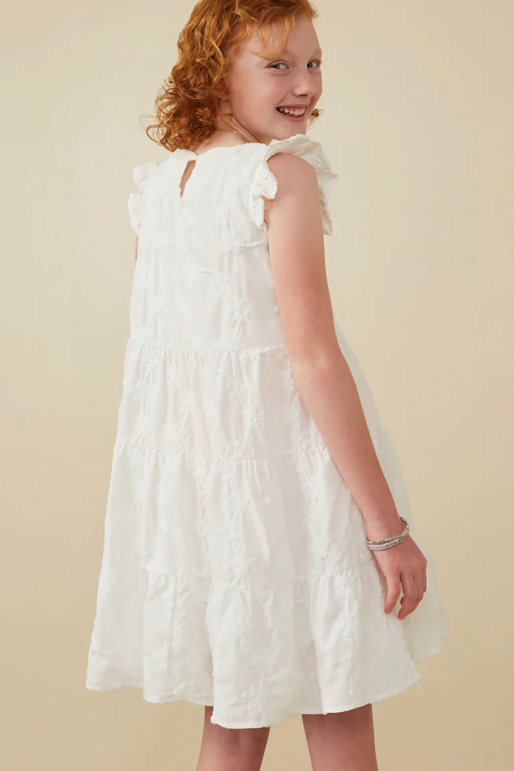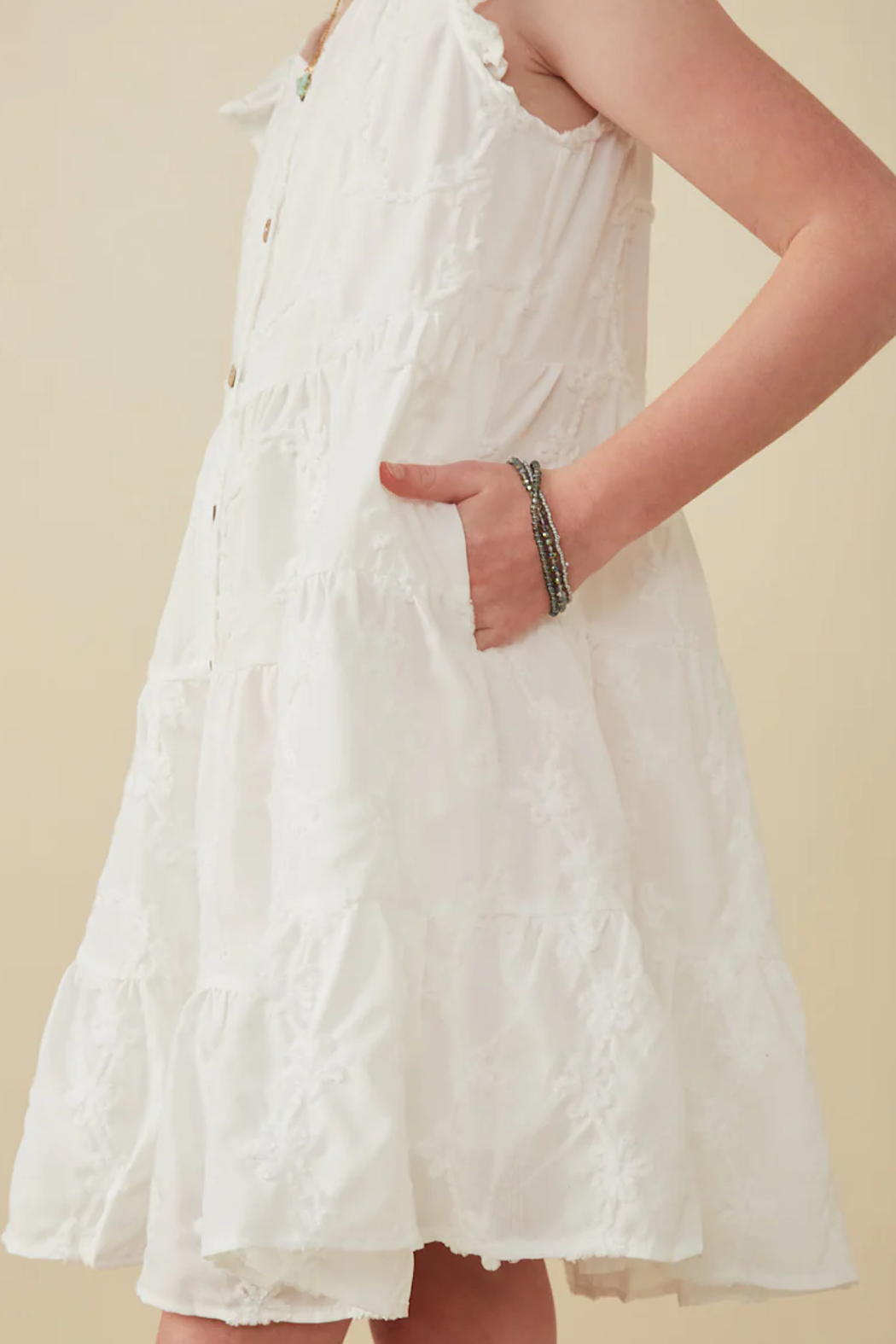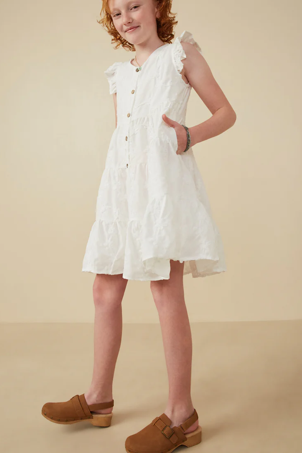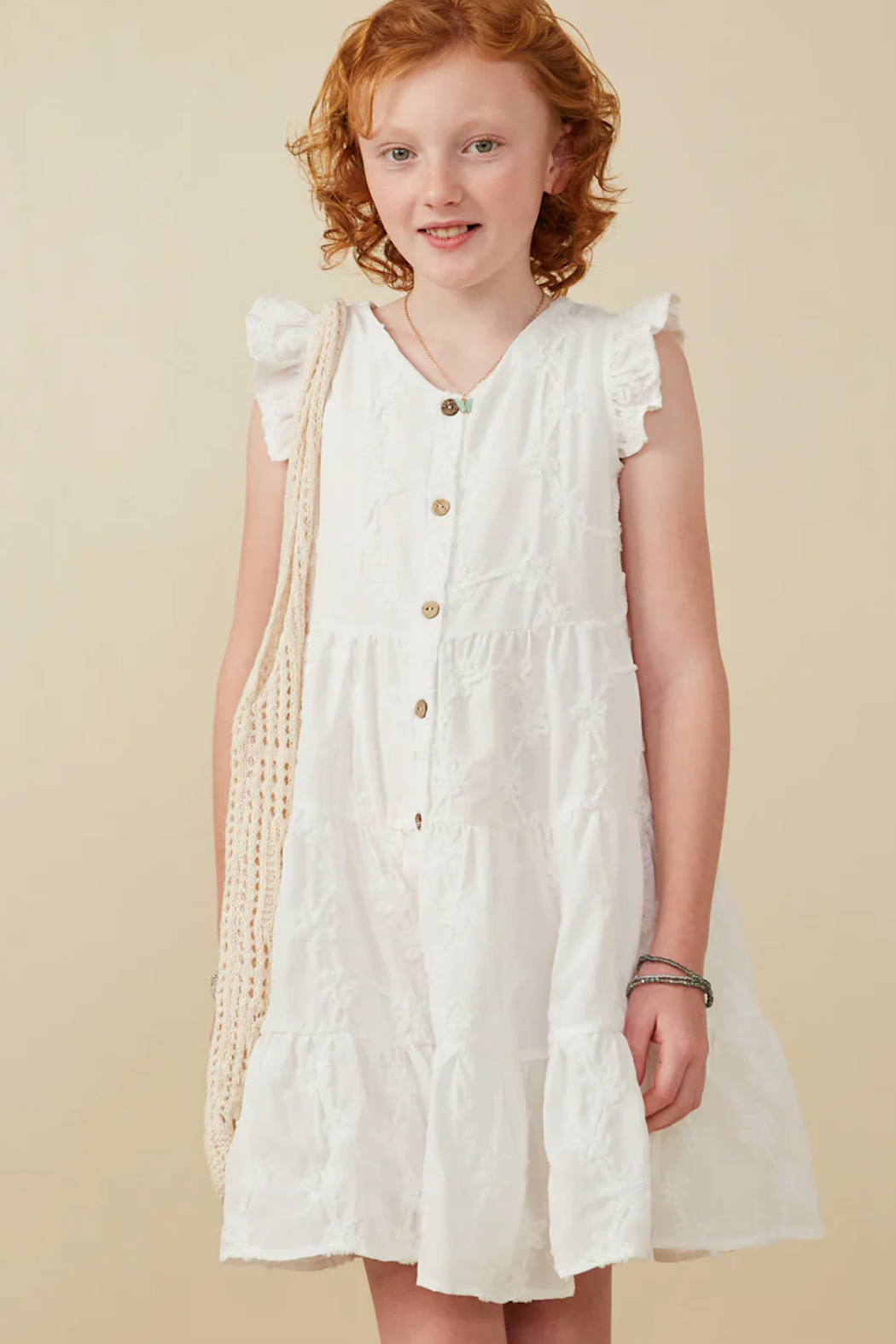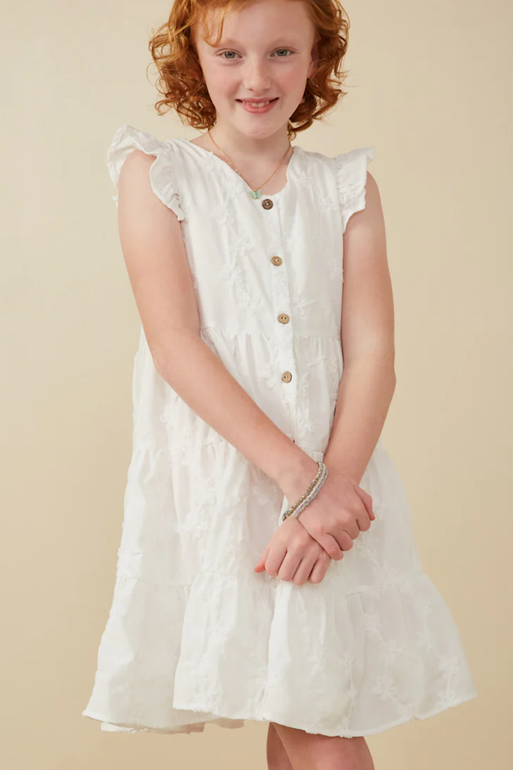 Crafted from textured floral fabric available in youth sizes, this dress features a tiered silhouette and decorative front buttons for a boho-inspired look. Designed with a comfortable lining, it offers a perfect mom-and-me matching option. Shop the MATCHING WOMEN HERE.