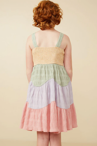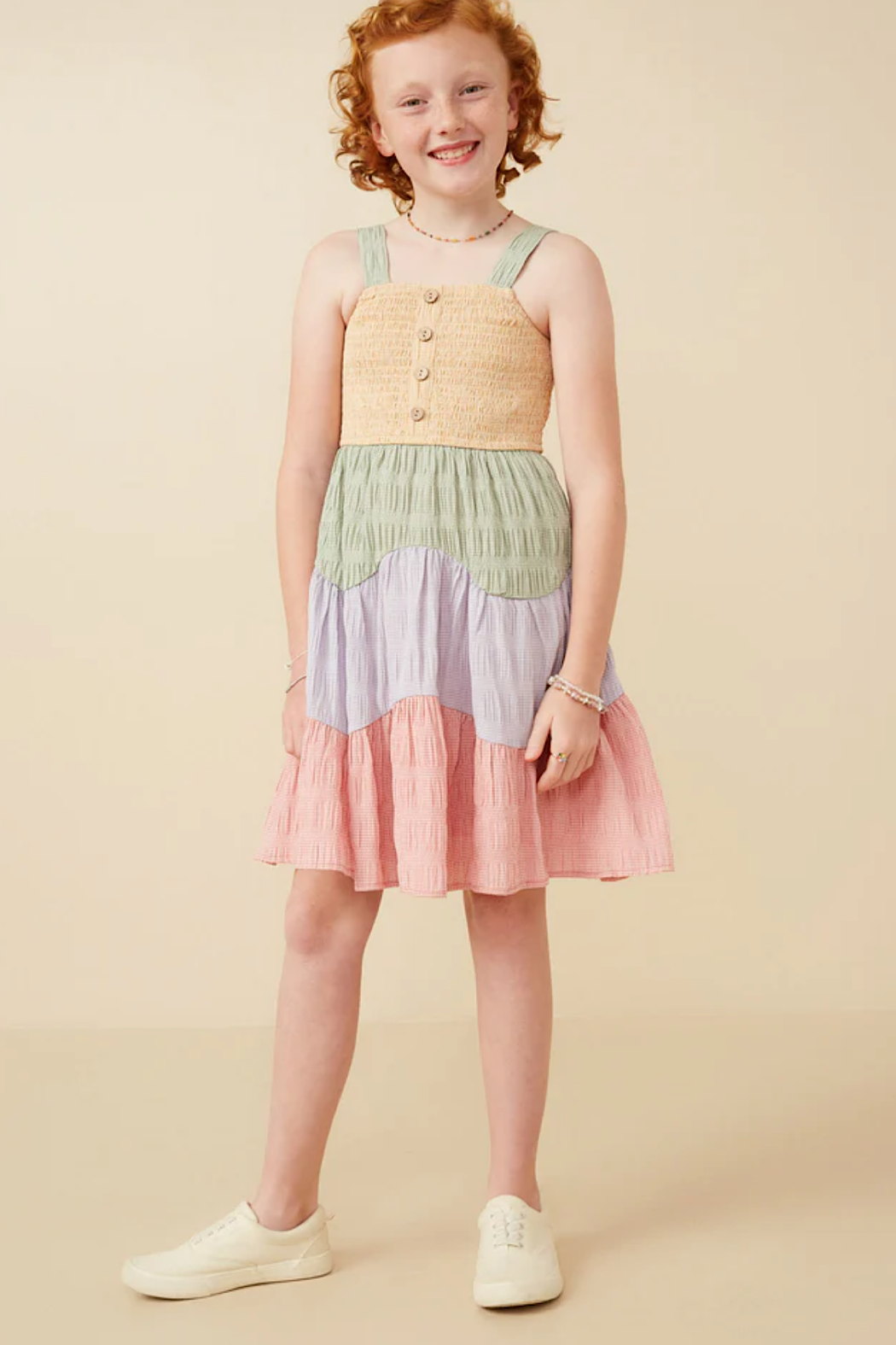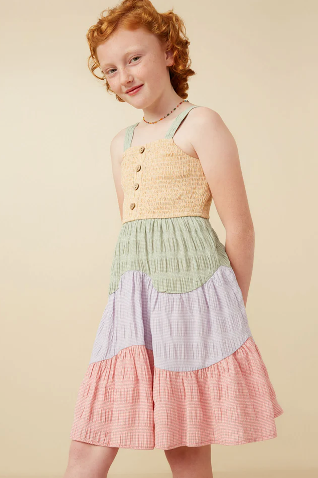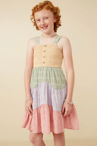 This woven dress features a wavy tiered color block design, enhanced with button accents and smocked detailing for a refined, textured look. Shop the MOM & ME DRESS for a complete duo look!